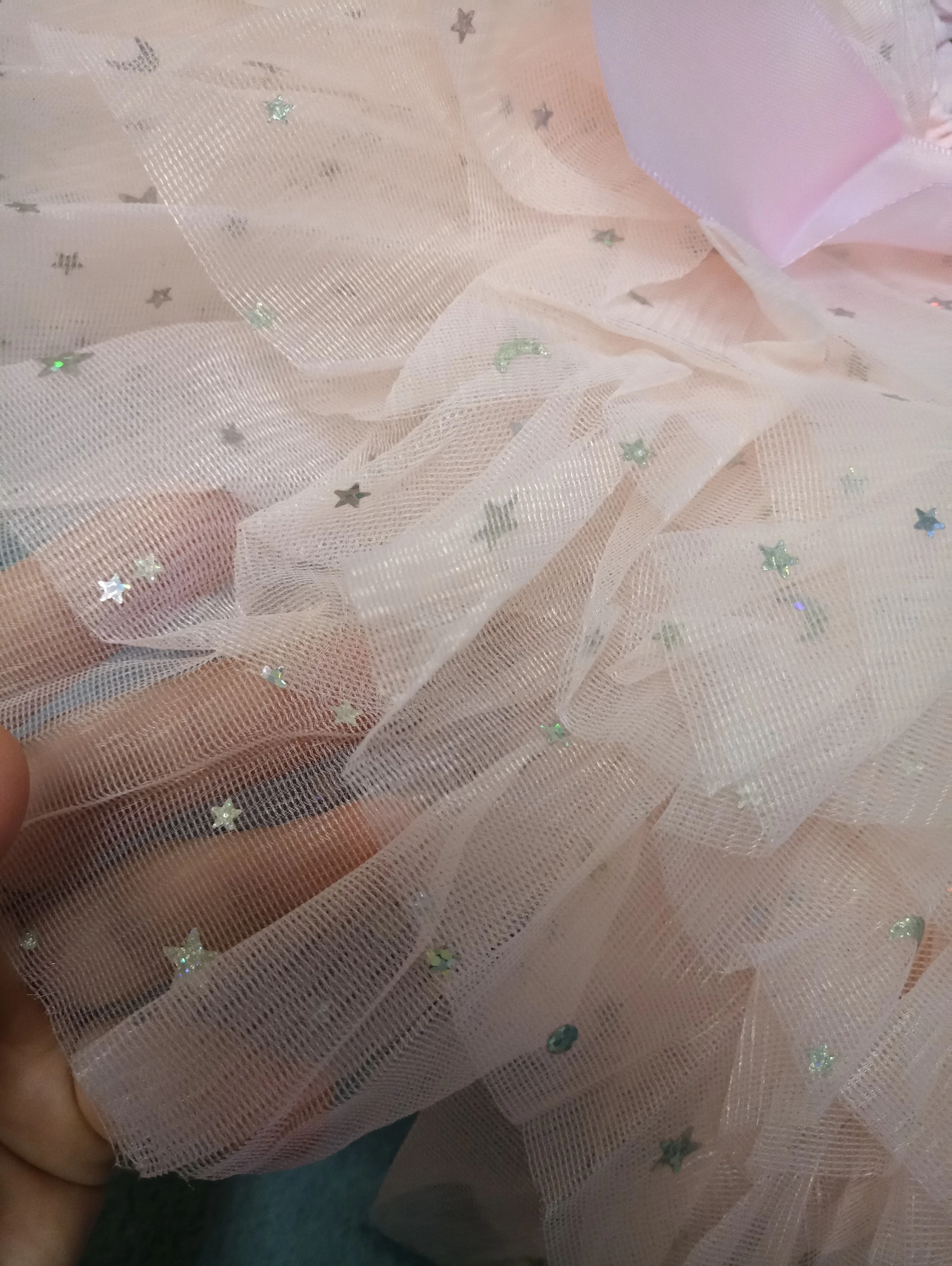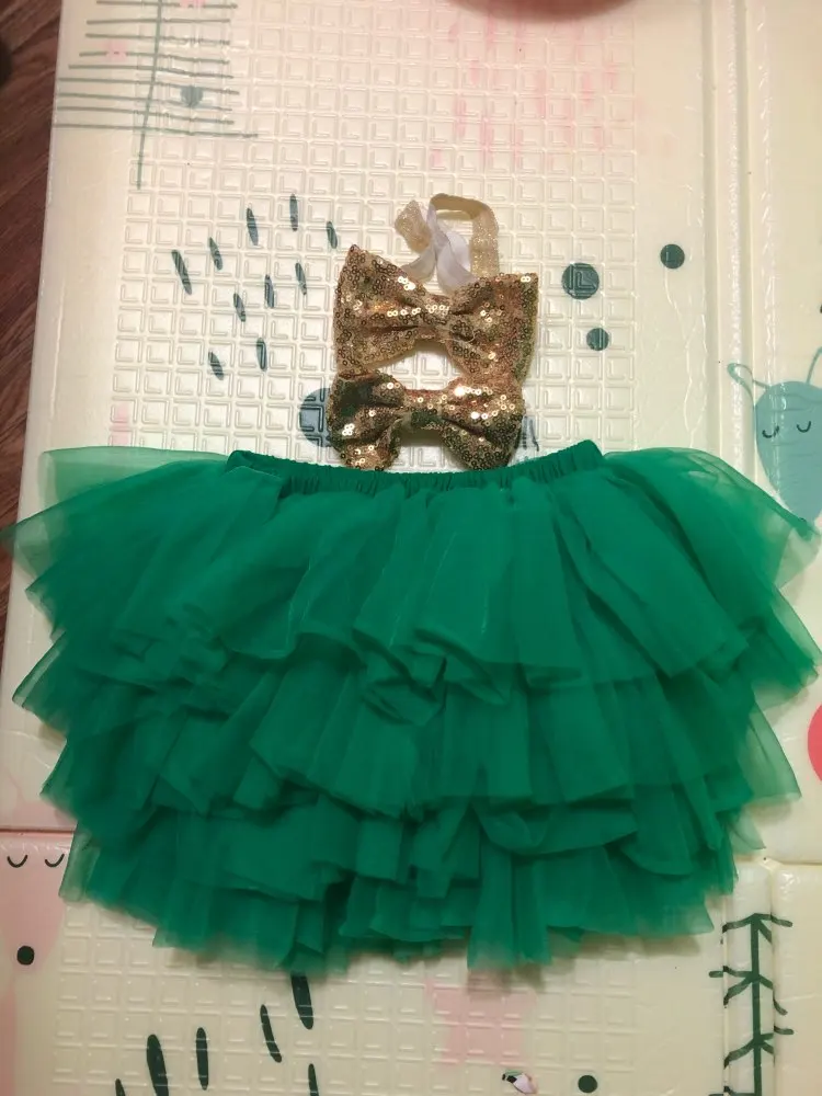 Это уже вторая наша юбочка. Первая розовая. У зелёной резинка потуже. Бантик ужасный, блески отпадывают, но если оценивать юбку, то она классная. Цвет яркий, ткань мягкая, пушистая. Звезду за бант снимать не буду, так как тут главное юбка!