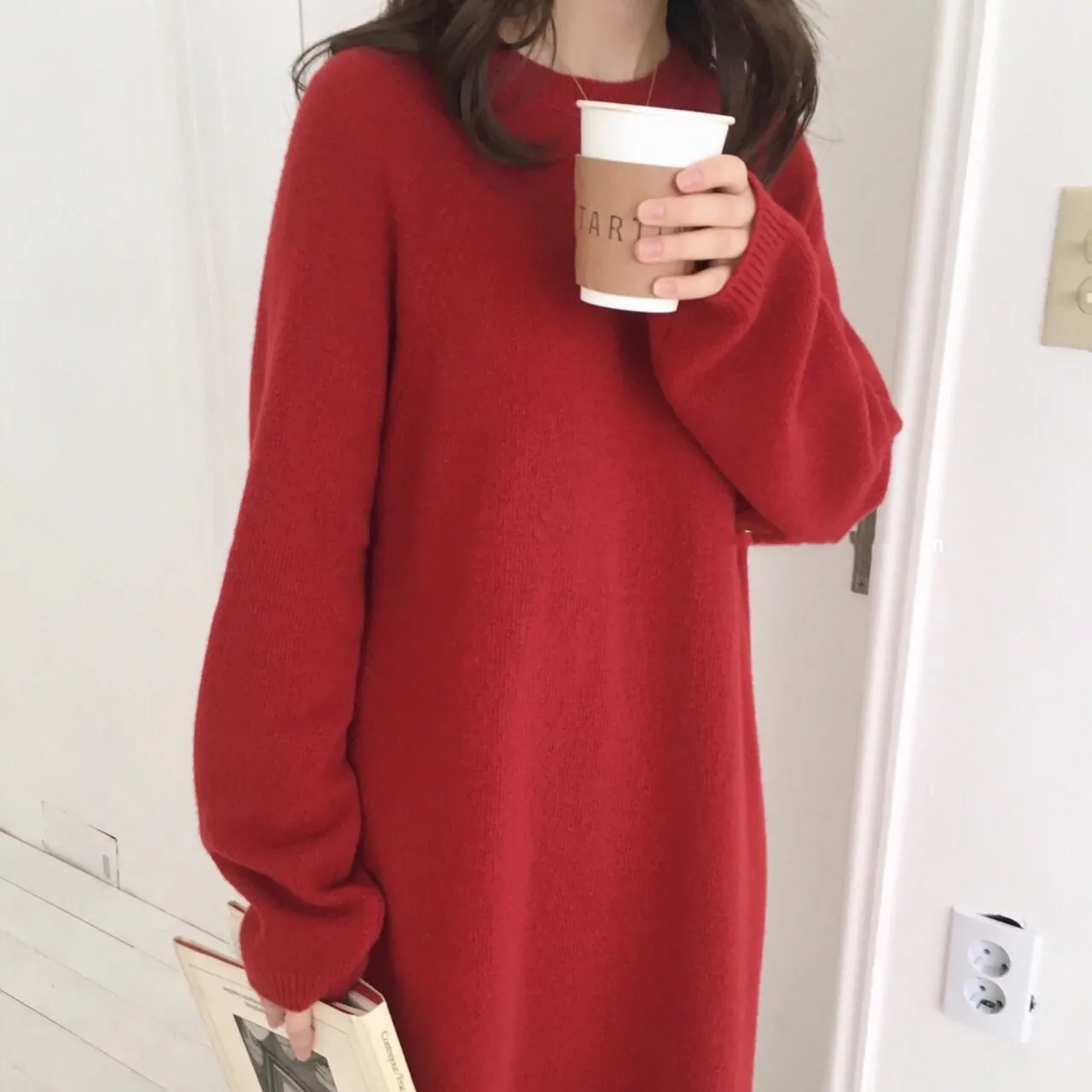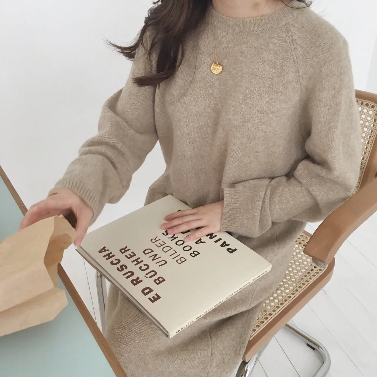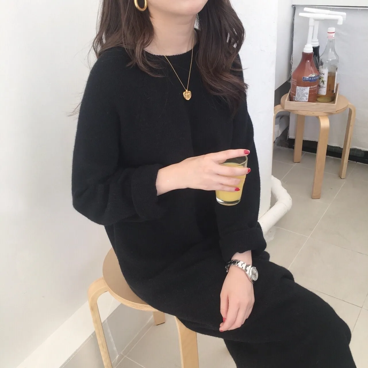 Женское осенне-зимнее длинное вязаное платье-свитер, Женский пуловер с длинным рукавом, прямой, большого размера, с круглым воротником