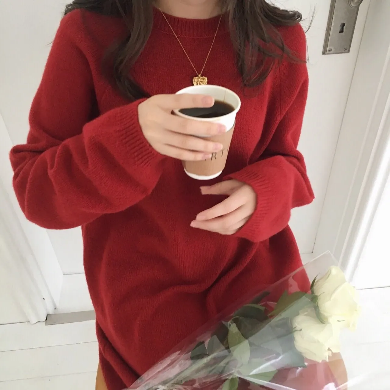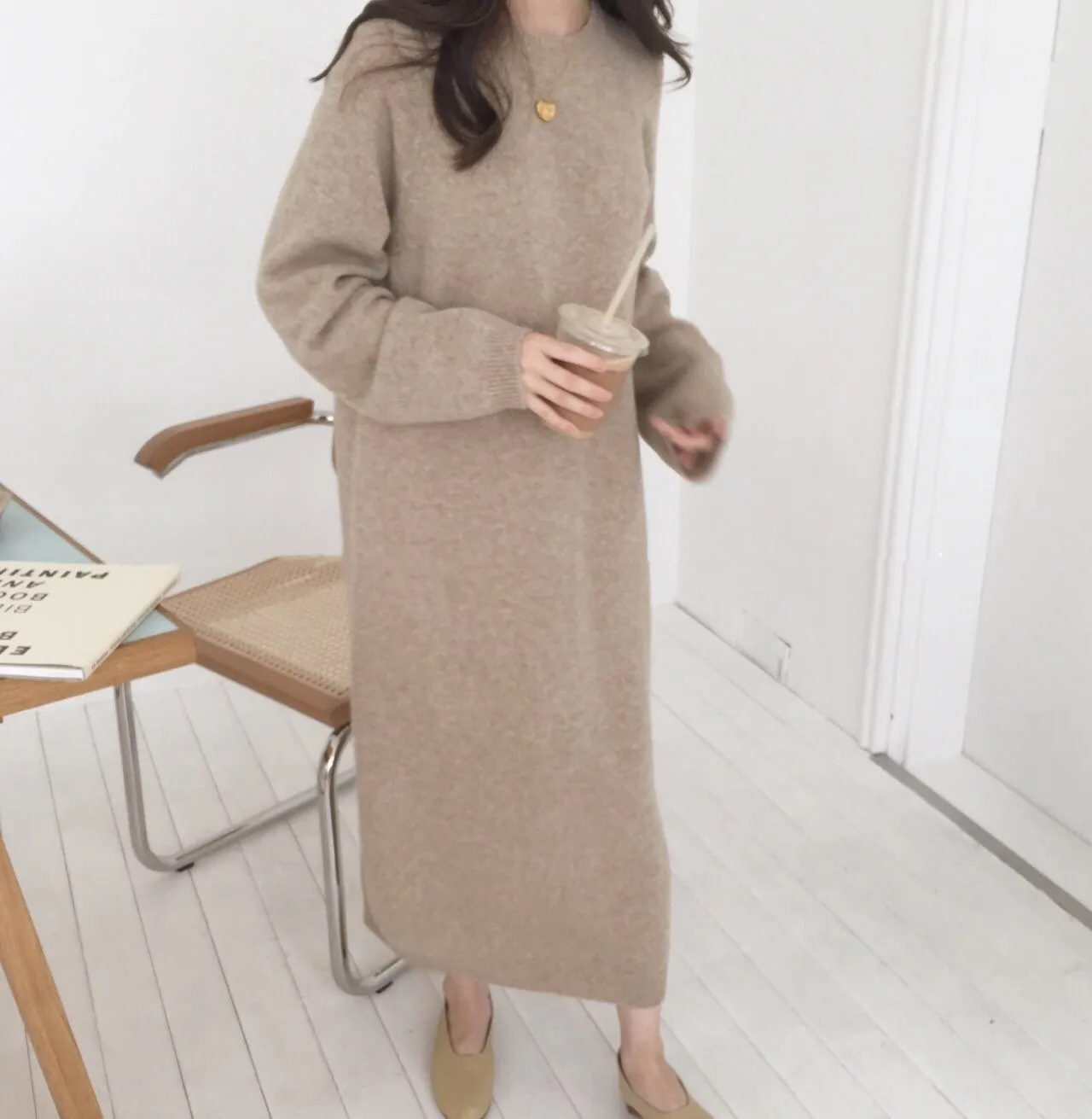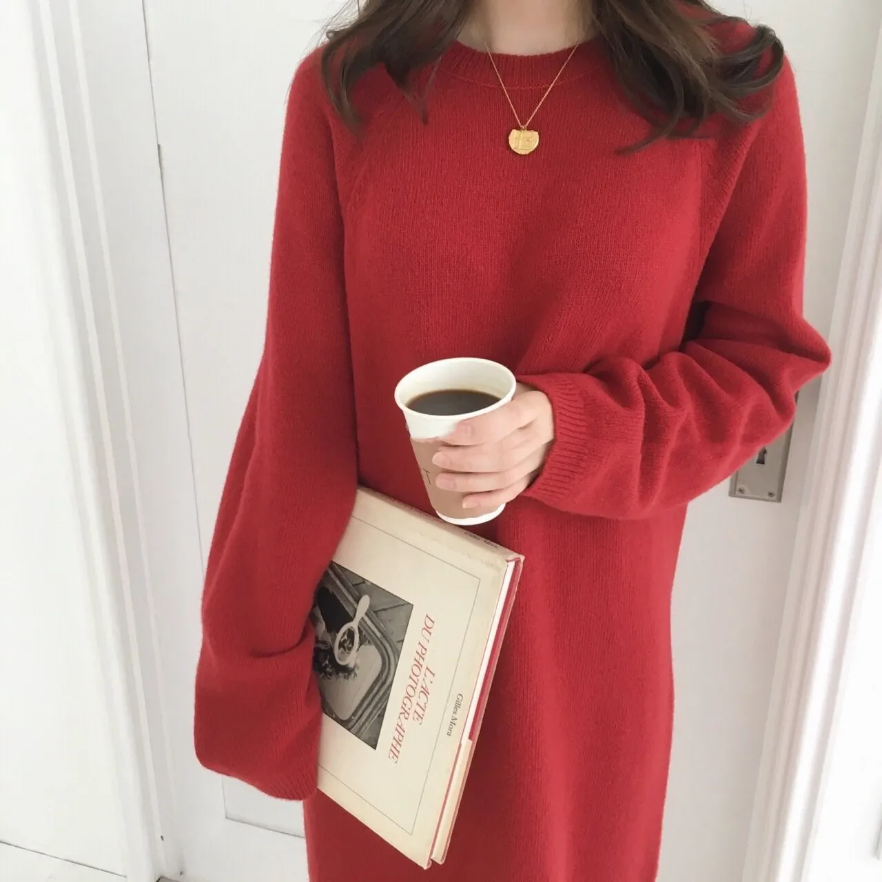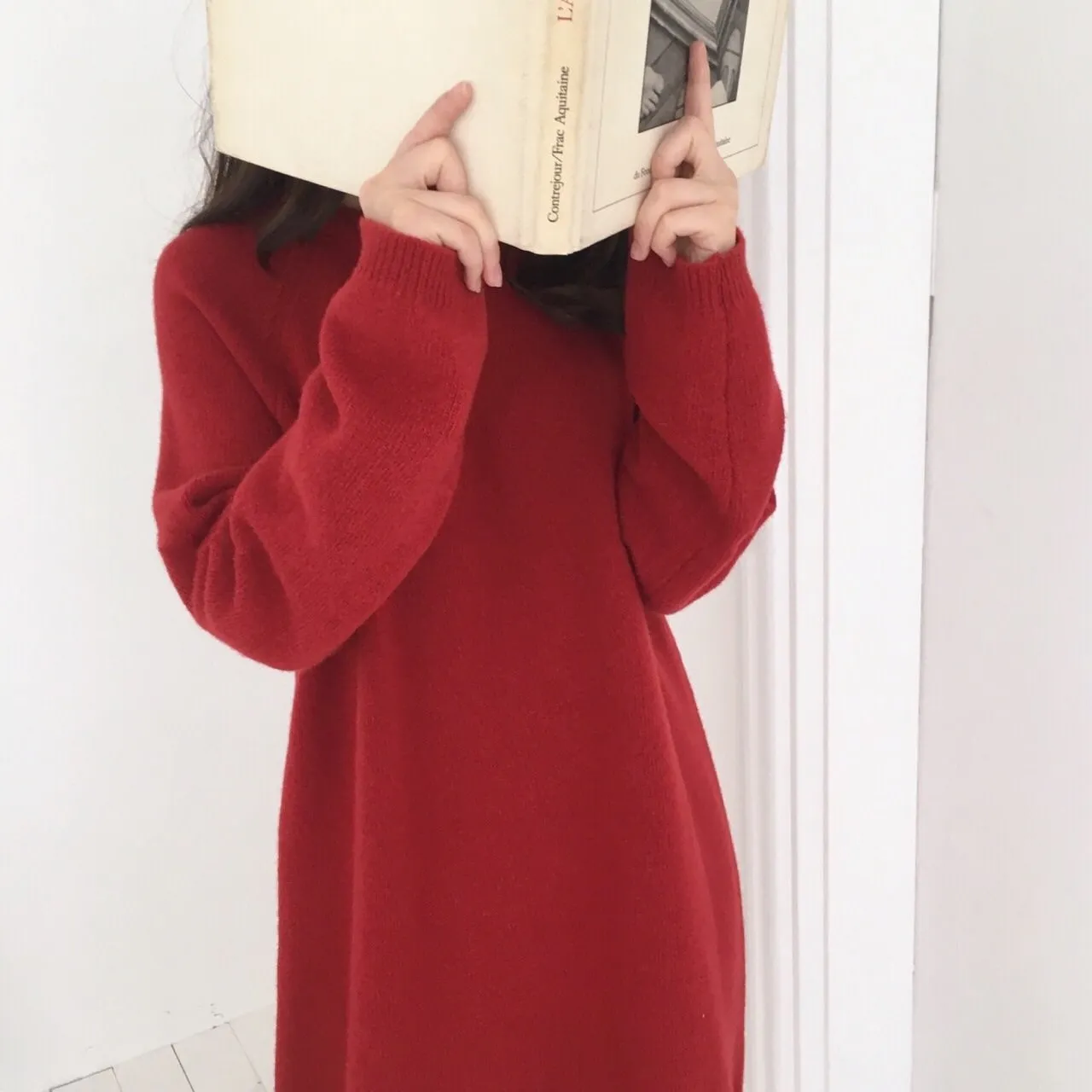 Женское осенне-зимнее длинное вязаное платье-свитер, Женский пуловер с длинным рукавом, прямой, большого размера, с круглым воротником