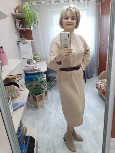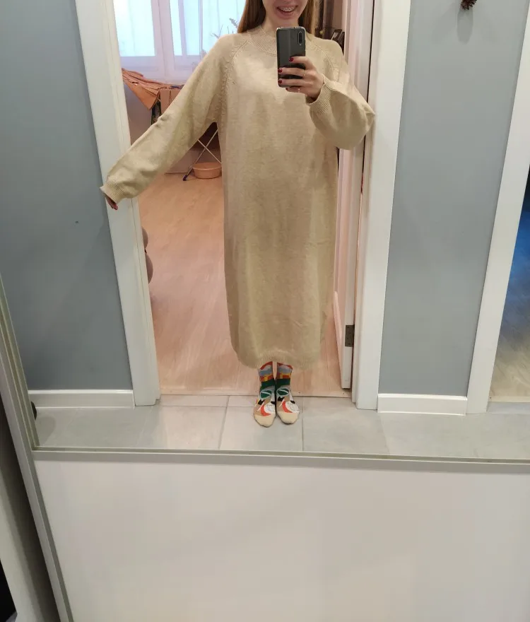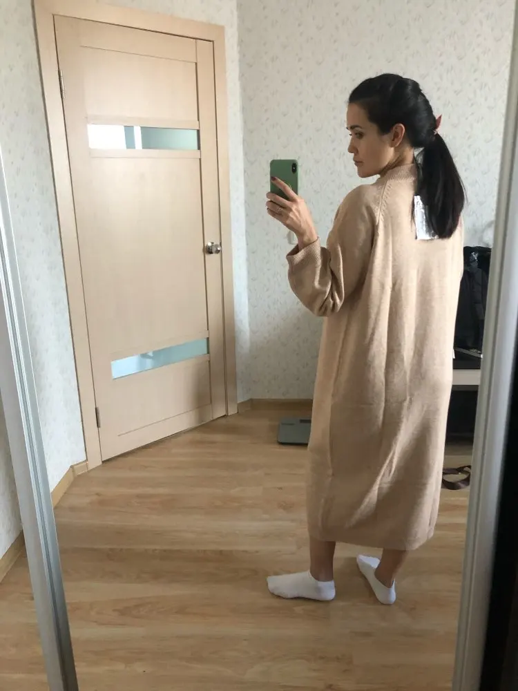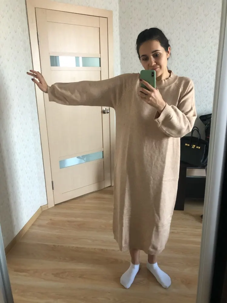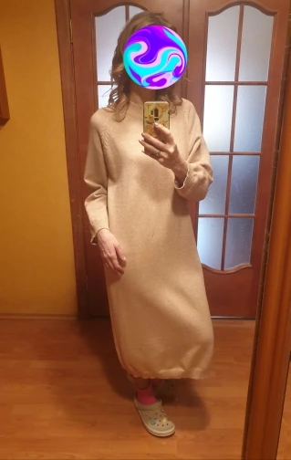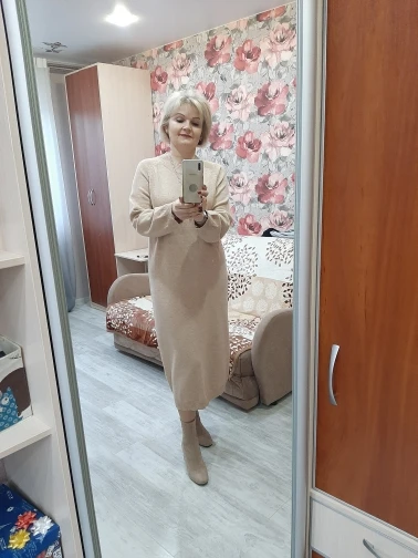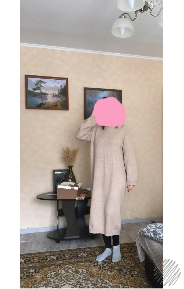 Заказала 19.12.2020. Немного затянутая доставка. С 27.12 посылка зависла в Харбине. Писала продавцу, ответили, что все нормально, посылку доставят в срок)) Появилась только 13.01 уже в Екатеринбурге, 18.01 прибыла на почту в Иваново. Месяц! Платье порадовало!!! Плотный, тяжеленький трикотаж, тянется. Цвет немного отличается от фото продавца, теплее, как песок. Мне цвет очень понравился! Но на фото он не получился. Единственная странность, очень заминаются складки! Отпарила, посидела 3 минуты на диване - на попе складки! ((( И на животе немного. Влажной рукой помочила, отвиселись, но не до конца, надо опять отпаривать( Но это единственное, что напрягло. На рос 46-48(ог 90, от 80, об 101) рост 172 оверсайз. И по длине ниже колена см на 20. Ширина в разложенном виде от подмышки до подмышки 58 см, в районе бедер 57см, длина от плеча у горловины до низа 117 см. Спасибо продавцу! Платье понравилось!!! Как и хотела, оверсайз и длинное!