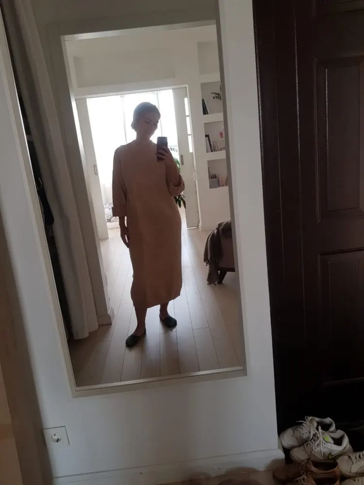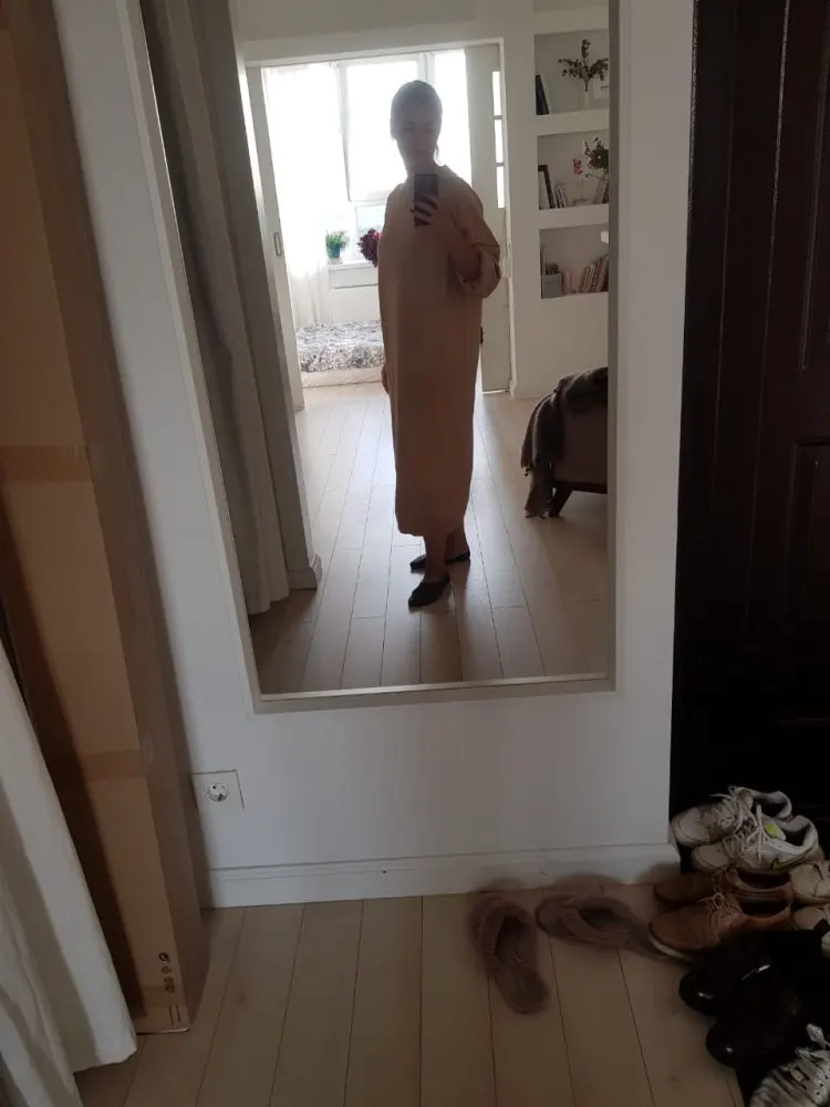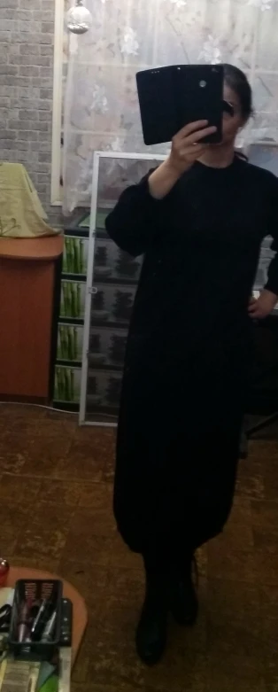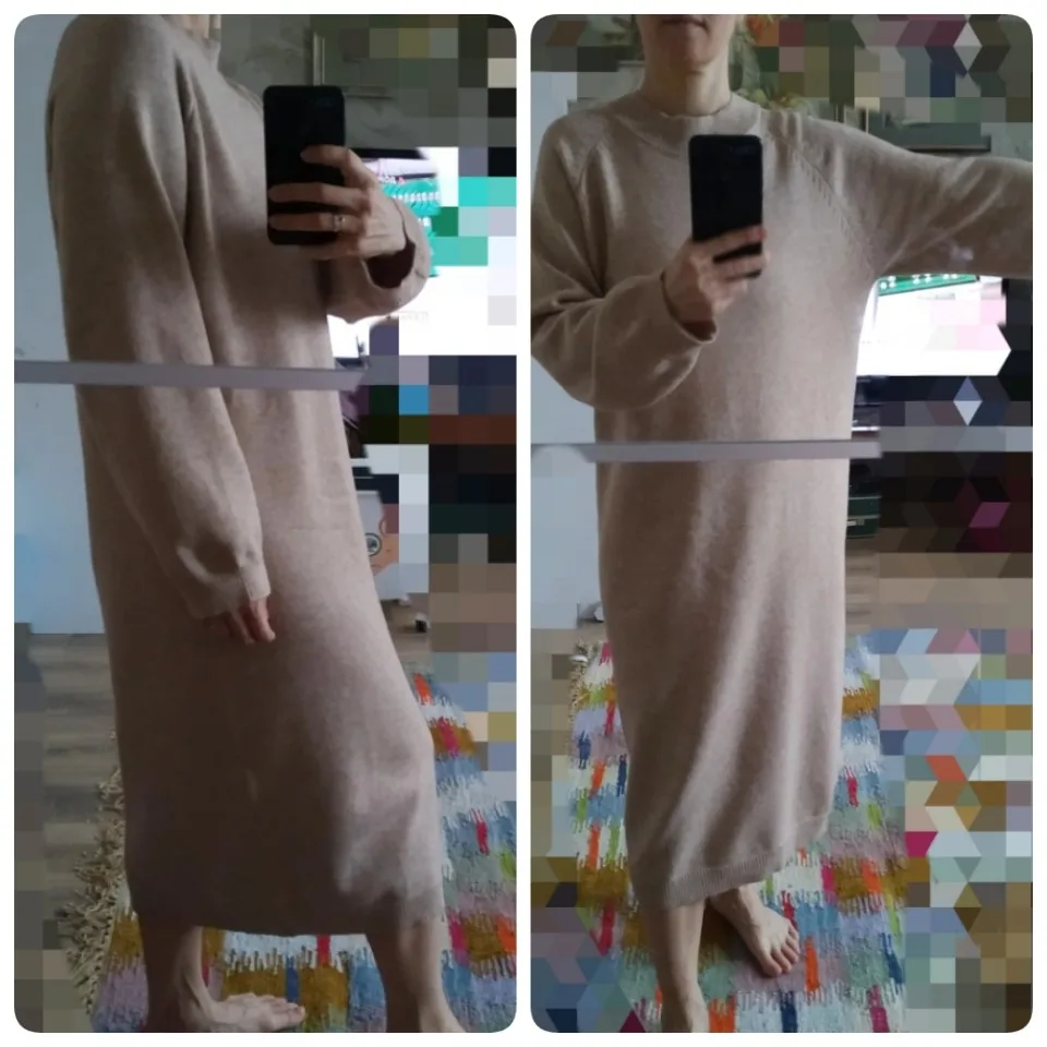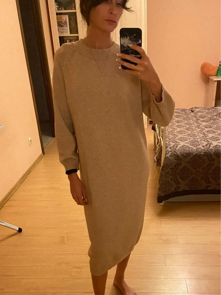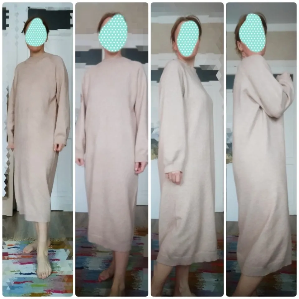 Заказала 19.12.2020. Немного затянутая доставка. С 27.12 посылка зависла в Харбине. Писала продавцу, ответили, что все нормально, посылку доставят в срок)) Появилась только 13.01 уже в Екатеринбурге, 18.01 прибыла на почту в Иваново. Месяц! Платье порадовало!!! Плотный, тяжеленький трикотаж, тянется. Цвет немного отличается от фото продавца, теплее, как песок. Мне цвет очень понравился! Но на фото он не получился. Единственная странность, очень заминаются складки! Отпарила, посидела 3 минуты на диване - на попе складки! ((( И на животе немного. Влажной рукой помочила, отвиселись, но не до конца, надо опять отпаривать( Но это единственное, что напрягло. На рос 46-48(ог 90, от 80, об 101) рост 172 оверсайз. И по длине ниже колена см на 20. Ширина в разложенном виде от подмышки до подмышки 58 см, в районе бедер 57см, длина от плеча у горловины до низа 117 см. Спасибо продавцу! Платье понравилось!!! Как и хотела, оверсайз и длинное!