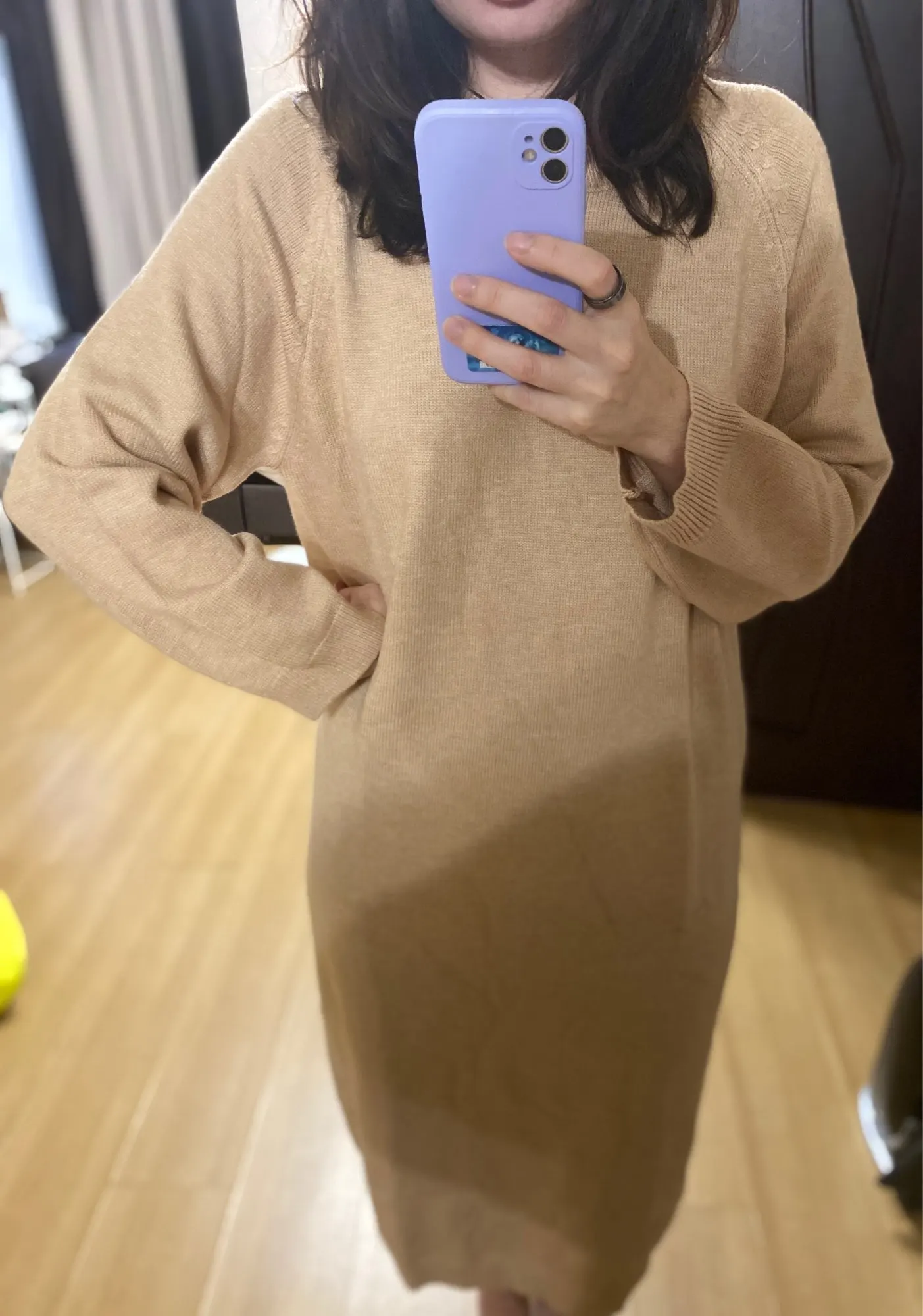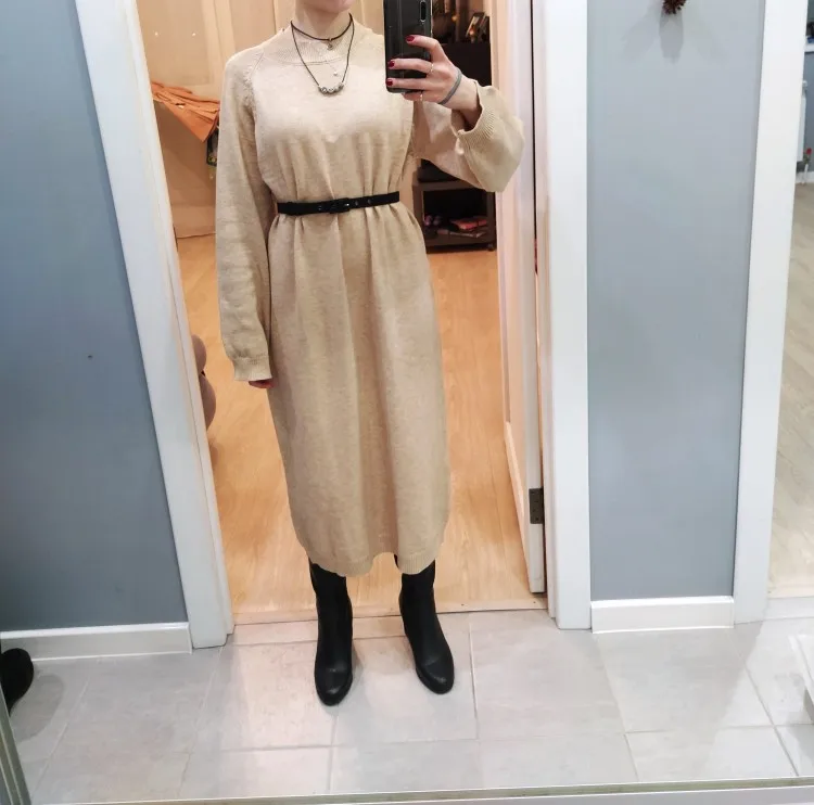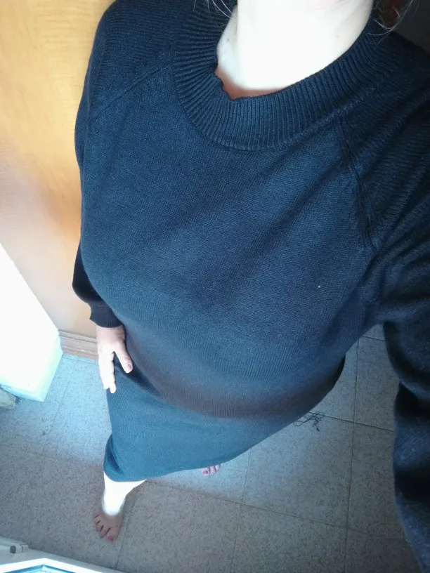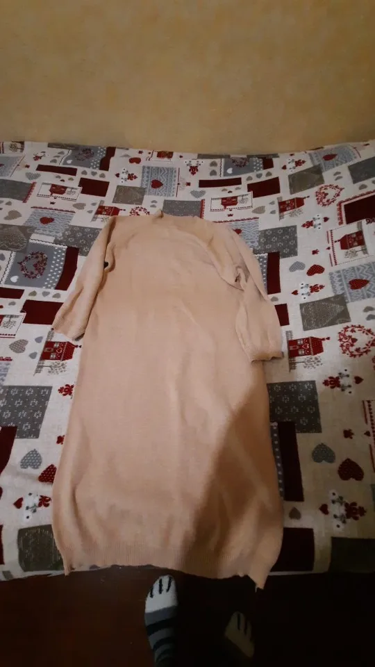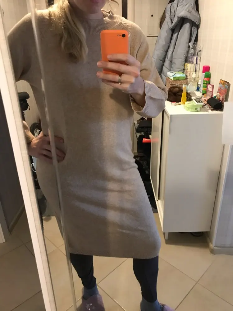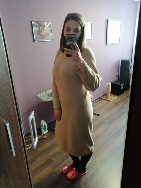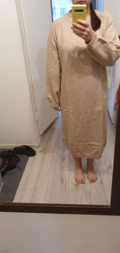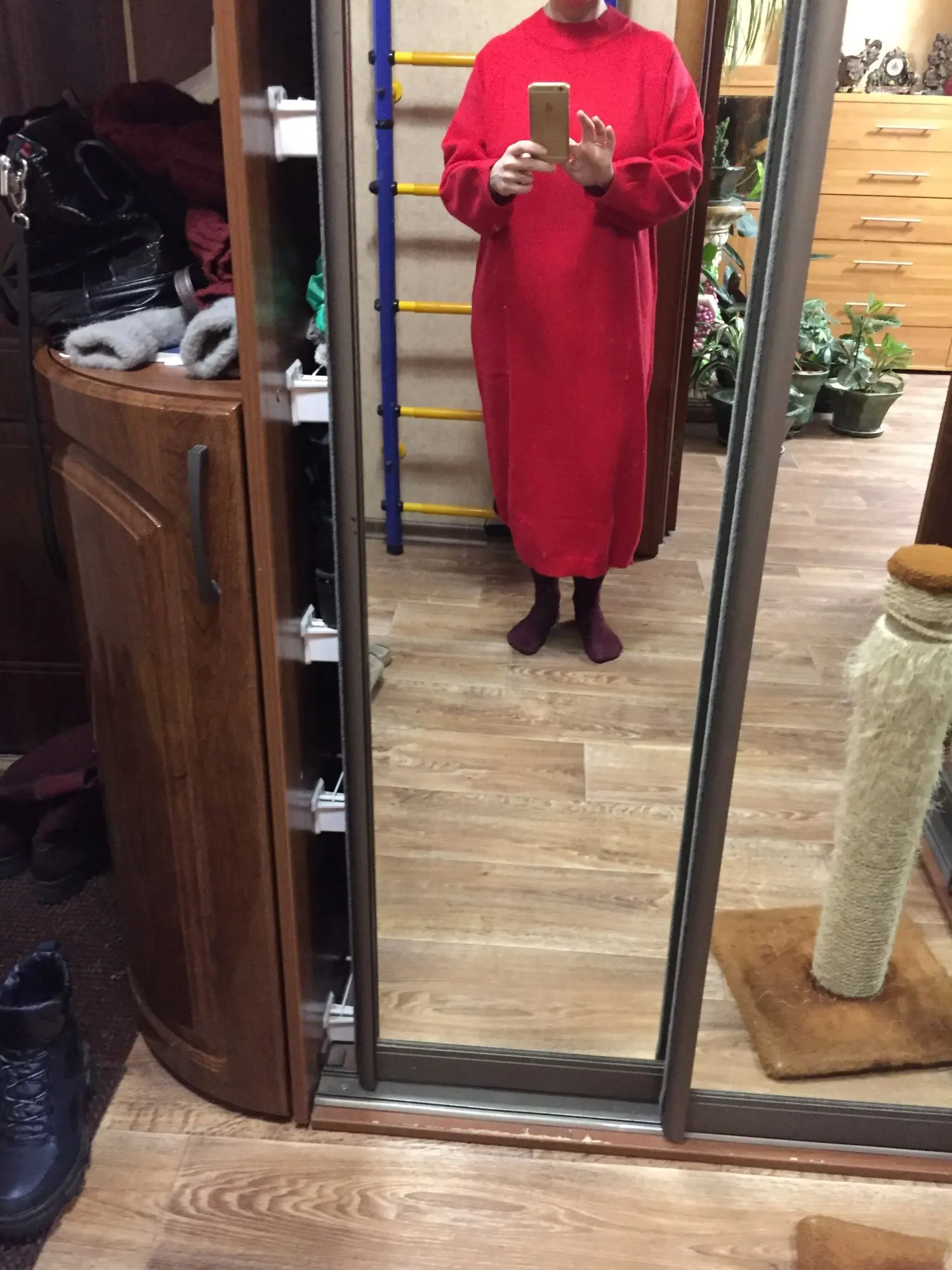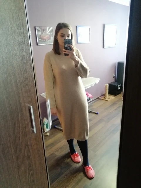 Милое мягкое платье-свитер просто приятно для холодной осенней погоды. Продукт хорошего качества, как описано, и длина платья выше щиколотки на рост 155 см. Использование во время беременности 29 недель, и все еще имеет достаточно места. Если бы не был цвет, мы дали бы 5 звезд; Я бы ожидал, что он будет темнее, чем красный, а продукт-ярко-красный чили. В противном случае швы были пришиты довольно хорошо.
