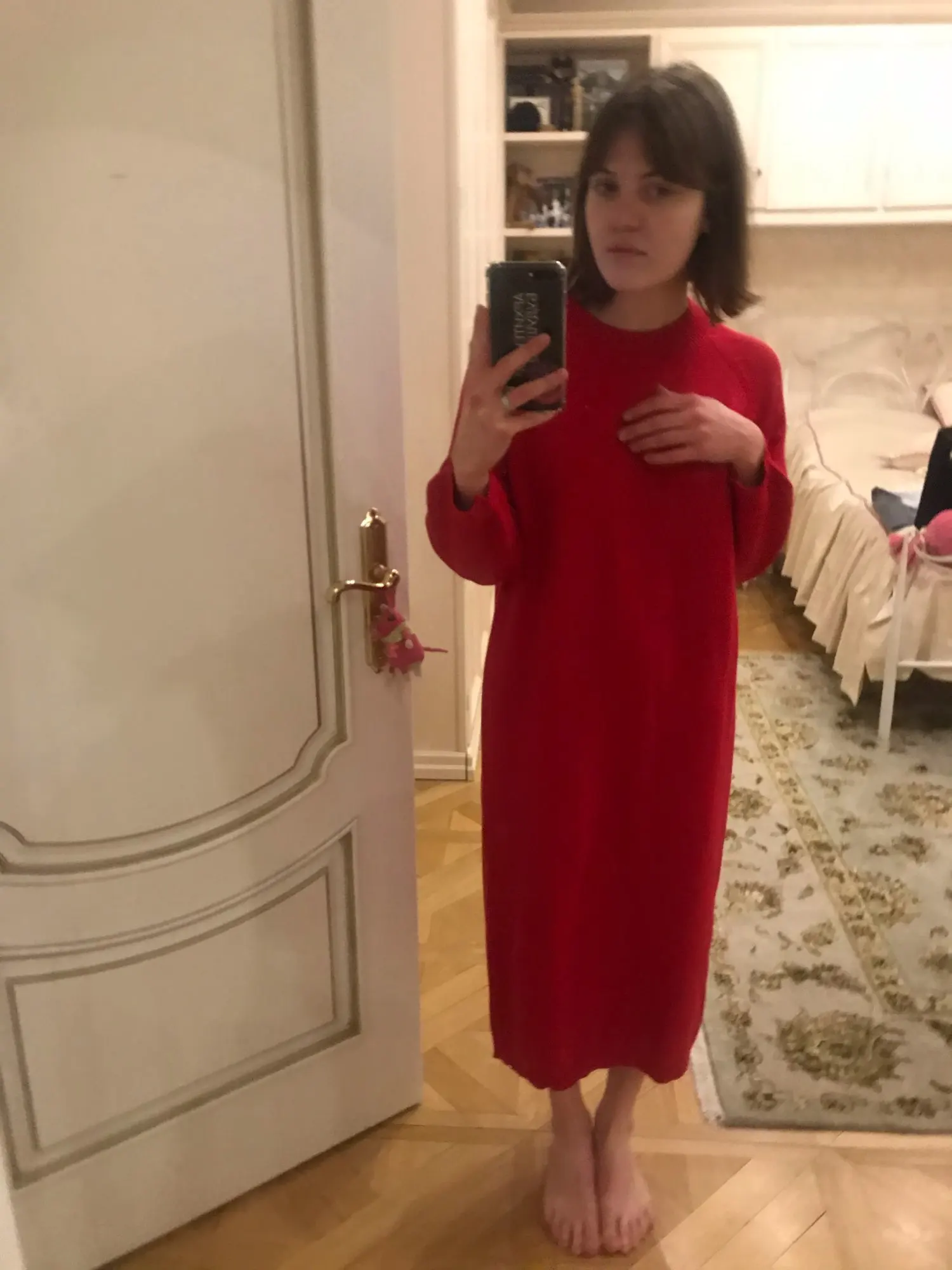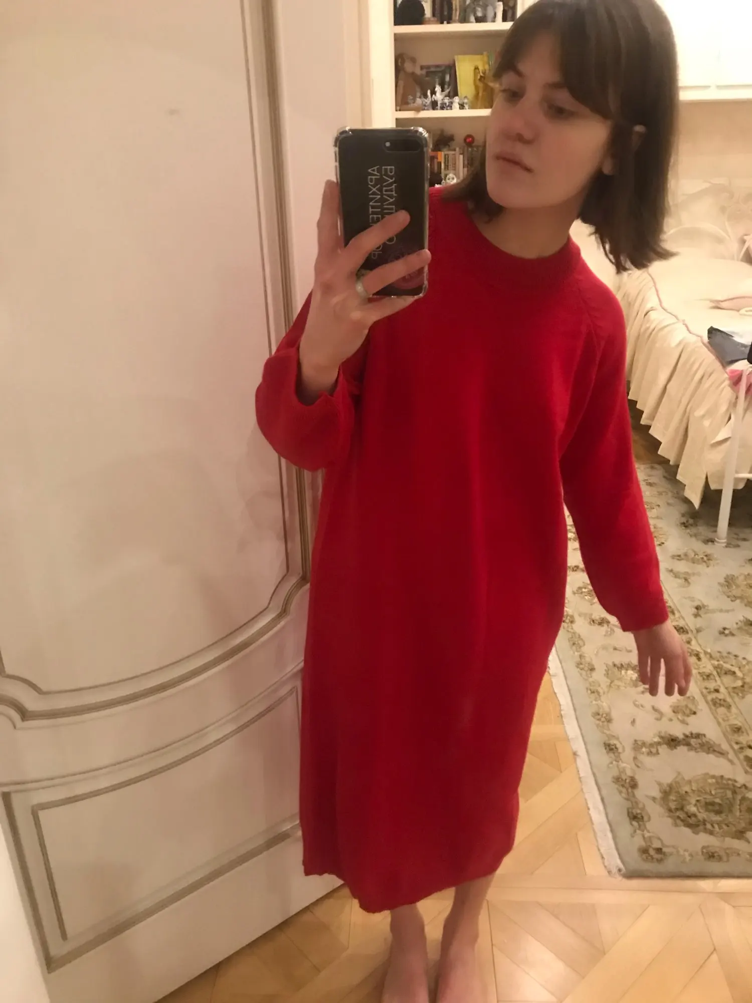 Платье ярко красного цвета, холодного оттенка. Ткань вроде хорошая, дефектов нет. Выглядит как на фото, но на фото все краство)) Объемное, внизу резинка. Возможно будет скатываться, так как акрил. Девочки размера xs-s - в нем можно утонуть, смотрится велико и как-то несуразно. На рост 170 - очень миди. Думала возвращать, но с поясом смотрится не плохо, в итоге оставила. К качеству претензий нет, спасибо продавцу, быстро отправил заказ! До Москвы пришел меньше чем за 2 недели.