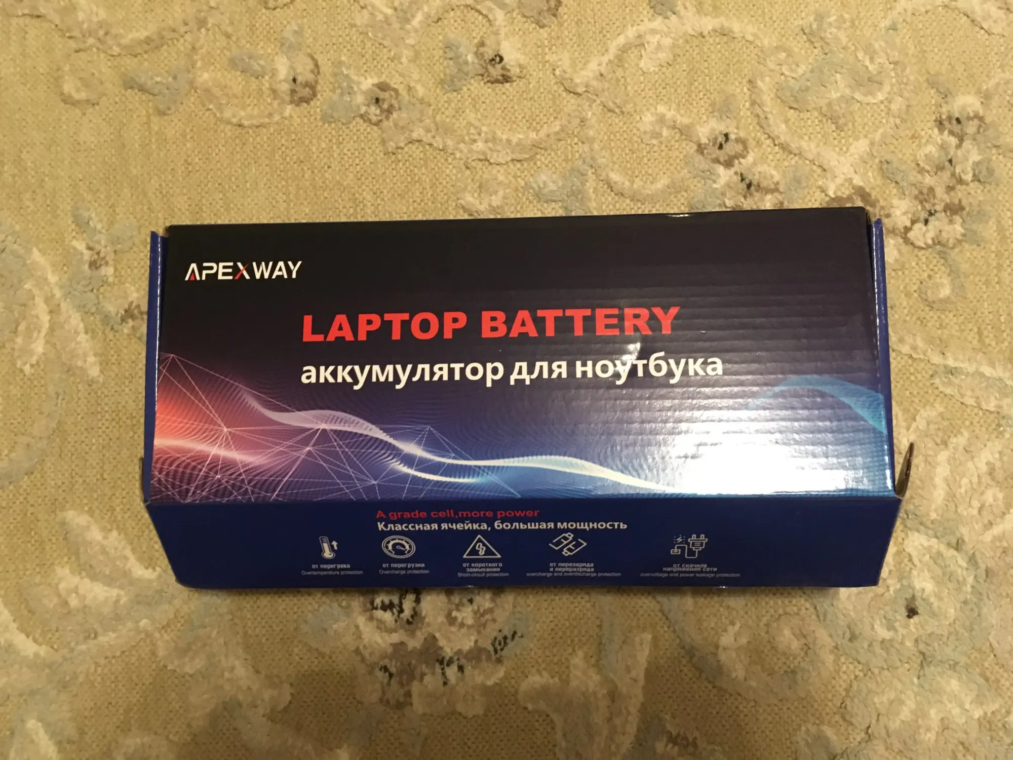 Покупал с доставкой из России. Приехал за неделю. Упакован в антистатический пакет, в коробку, переложен паралоном. Приехал разряженным. Полностью заряженного хватает на 2,5-3 часа.
