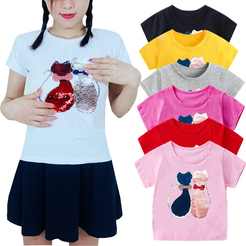 Двусторонняя Блестящая футболка с блестками для девочек, футболка с блестками Детская футболка с рисунком кота для девочек Летняя подростковая одежда для девочек