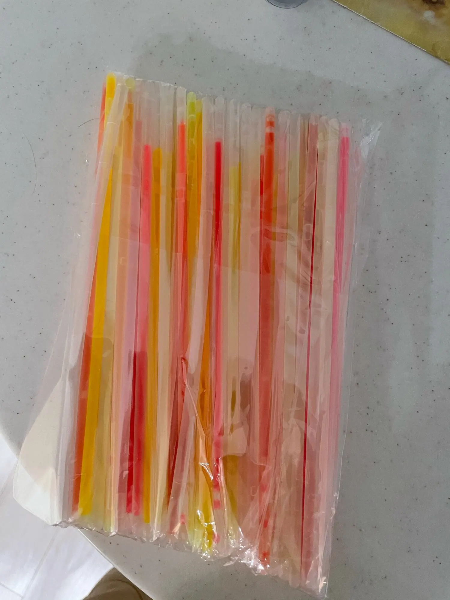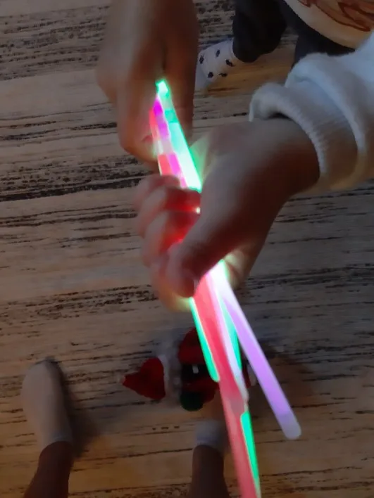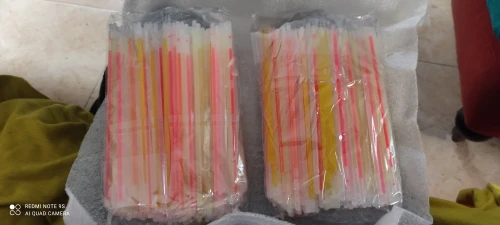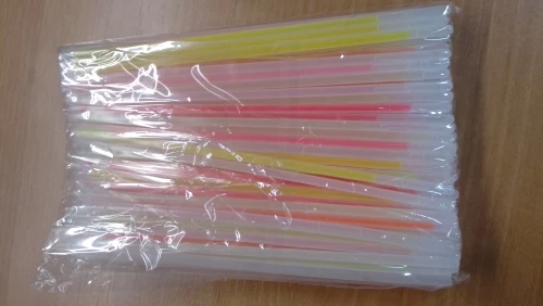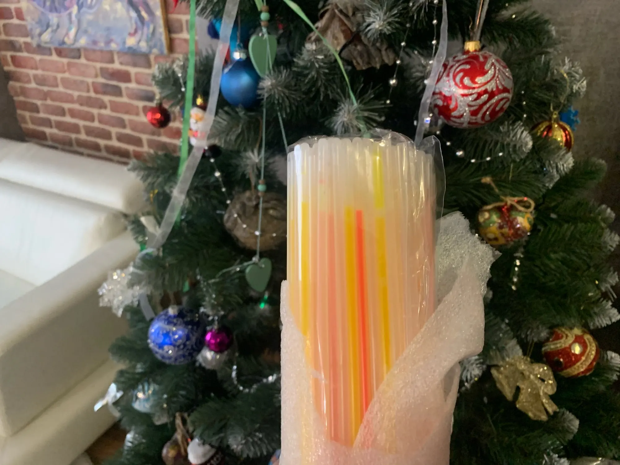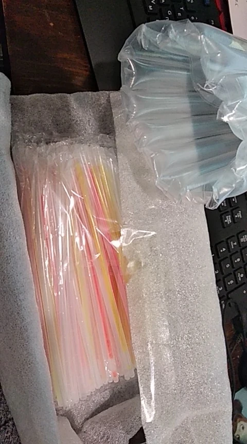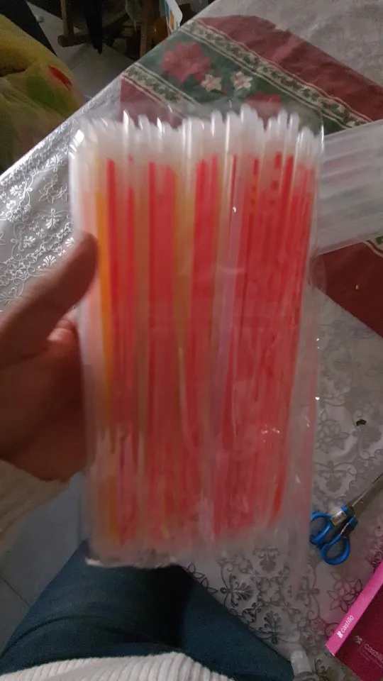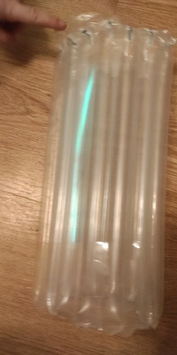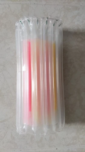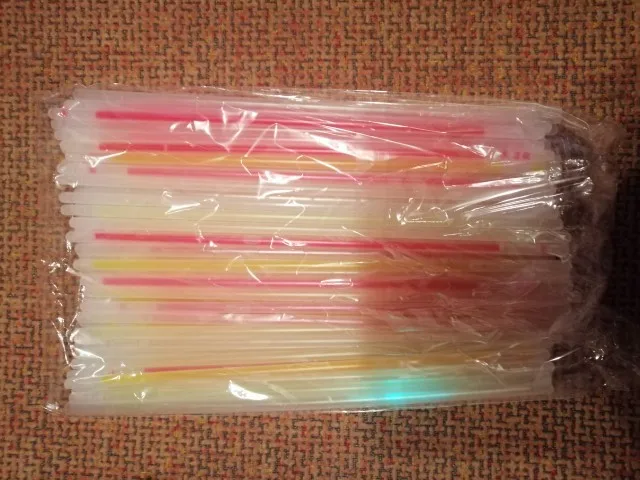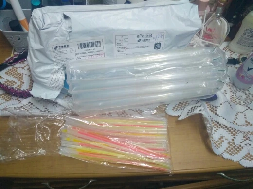 Ехало довольно долго, но успела к новому году. 100 штук светящихся палочек в кульке, без коробки, соединительные трубочки были не разделены и сложены вместе со стиками. Все вместе было завернуто в упаковку с воздушными отсеками, как для хрупких грузов. Цвета, что приехали - синий, оранжевый, красный, зелёный
