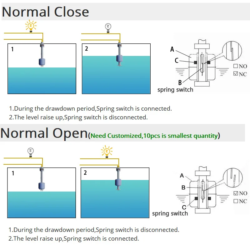 1. Нормальное закрытие (NC)2. Обычный открытый (нет) 1A:100 в 10 Вт2A:200 в 50 Вт Центр расстояния между двумя поплавковыми шариками 2:2 шары, 2 точки1-2:1 мяч, 2 точки переключения Диаметр резьбы Длина установленного в баке