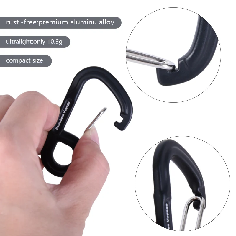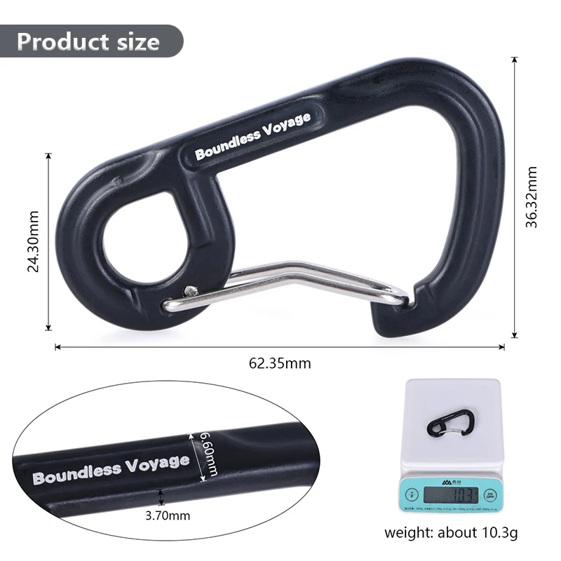 Особенности:Всего 10,3 г (0,3 унций), легкий и удобный.Изготовлен из 6061 алюминиевого сплава, износостойкий и прочный, никогда не ржавеет.Тип проволочных ворот, уменьшение ресниц ворот, и D образный дизайн обеспечивает больший размер использования.Широко используется для подвесных ключей, посуды, рюкзаков, бутылок, игрушек и т. Д.