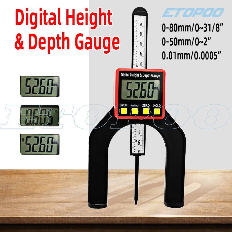 Изготовлен из легкого веса, его можно использовать для установки пильного полотна и фрезы, а также установить расстояние от ограждения маршрутизатора до бита. А также может использоваться для измерения глубины 50 мм. Материал: пластик с корпусом ABS Встроенные сильные магниты на дне. Разрешение: 0,01 мм/0,0005 дюйма Точность: ± 0,2 мм Работает от одного аккумулятора CR2032 3 В (не входит в комплект поставки)