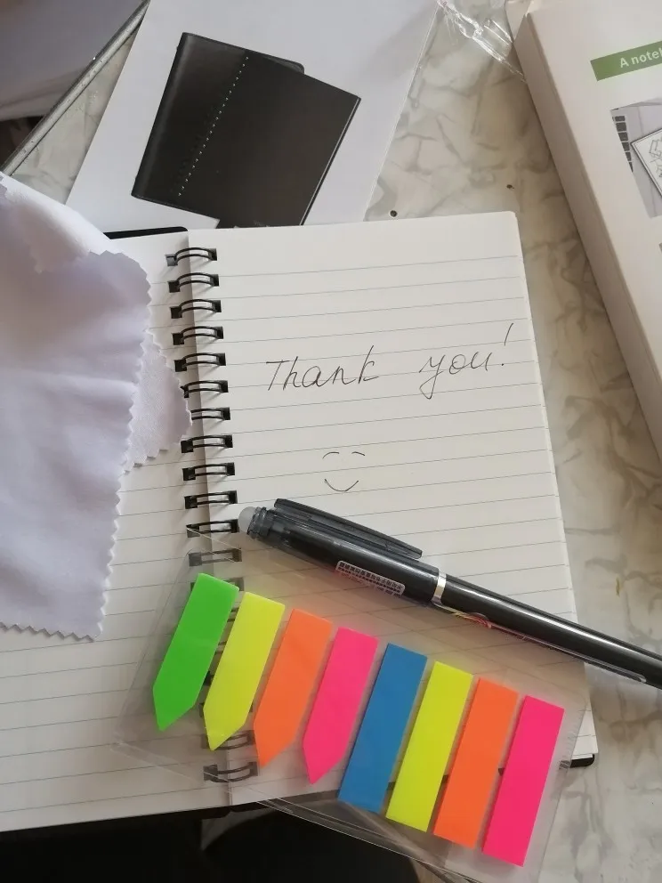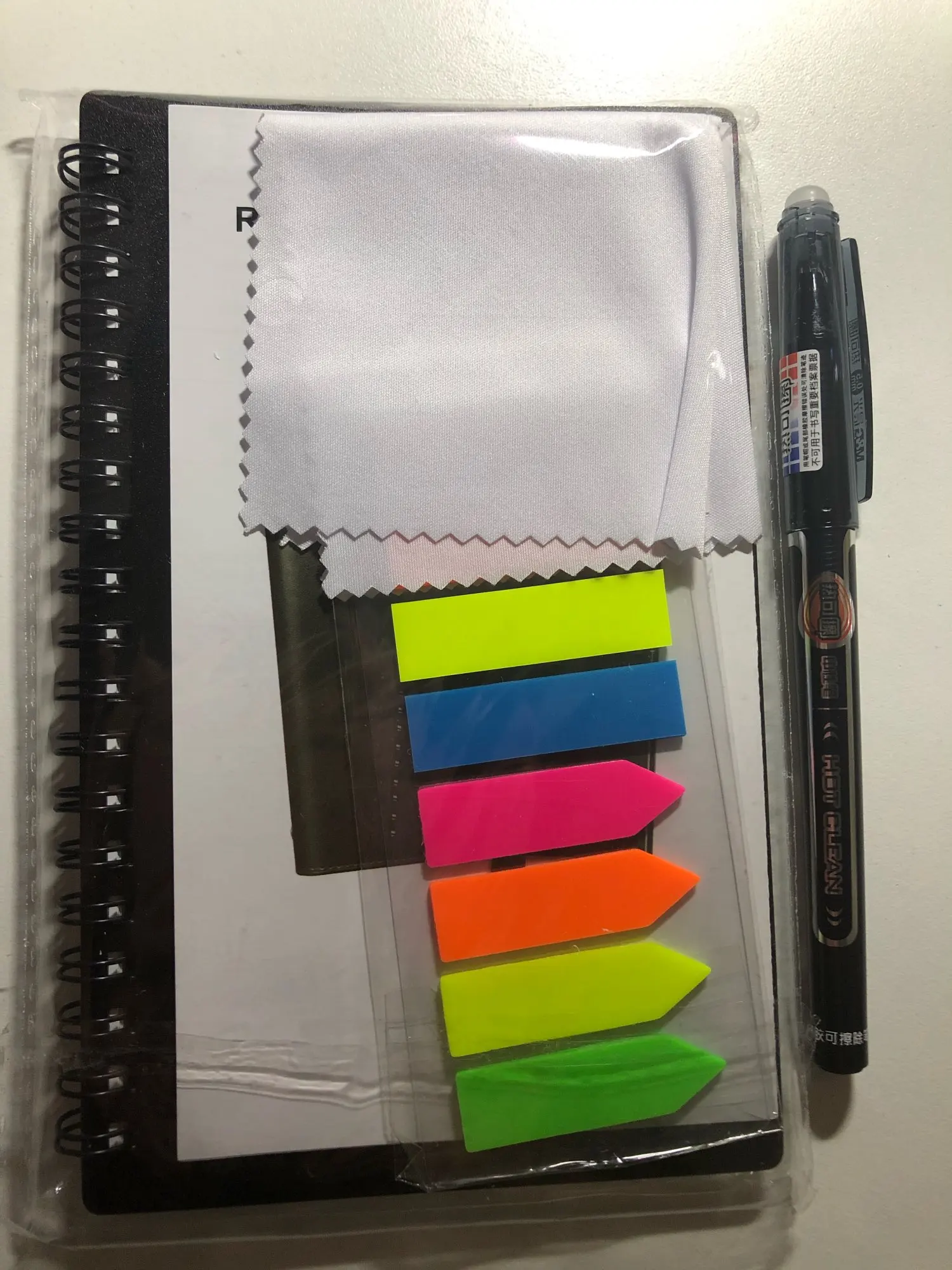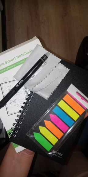 Заказываю в третий раз, первый себе, второй и третий на подарок - у него достаточно презентабельная упаковка, а мне хочется делиться с друзьями прекрасным. Блокнот невероятно удобный, я веду в нем bullet, и могу корректировать свои записи в любой момент - когда рисую или позже, и раньше меня бесило зачеркивать или замазывать - а тут можно просто стереть. Заказ все разы приходил мгновенно, даже заказ на 11.11 через неделю был у меня. Курьер приносит на дом. В составе кроме блокнота две ручки, тряпочка для стирания и цветные стикеры для страниц. По опыту прошлых заказов - за год активного использования у меня еще первая ручка не закончилась. Тряпочку нужно намочить, чтобы она стирала (видела в комментариях непонимание по поводу ее назначения). В общем идеальная вещь для тех, кто любит писать руками и при этом не любит помарок.