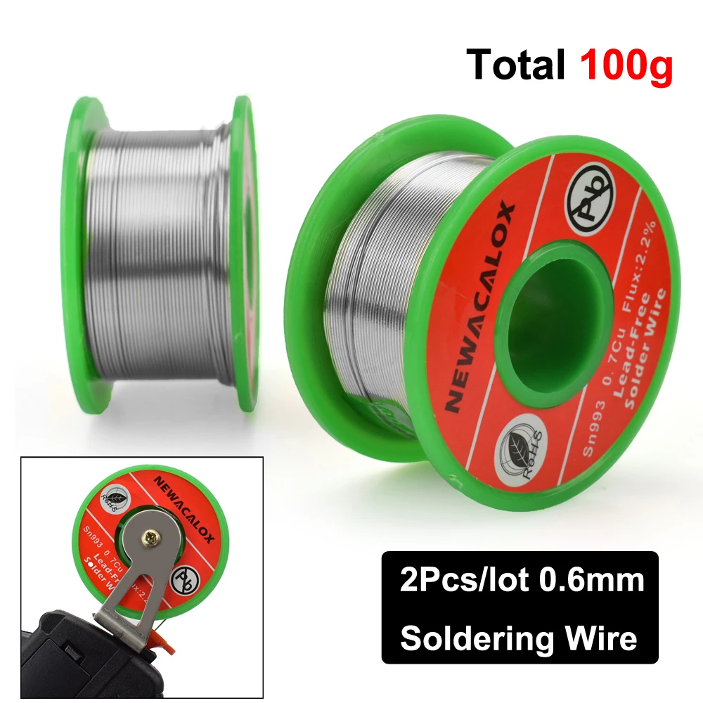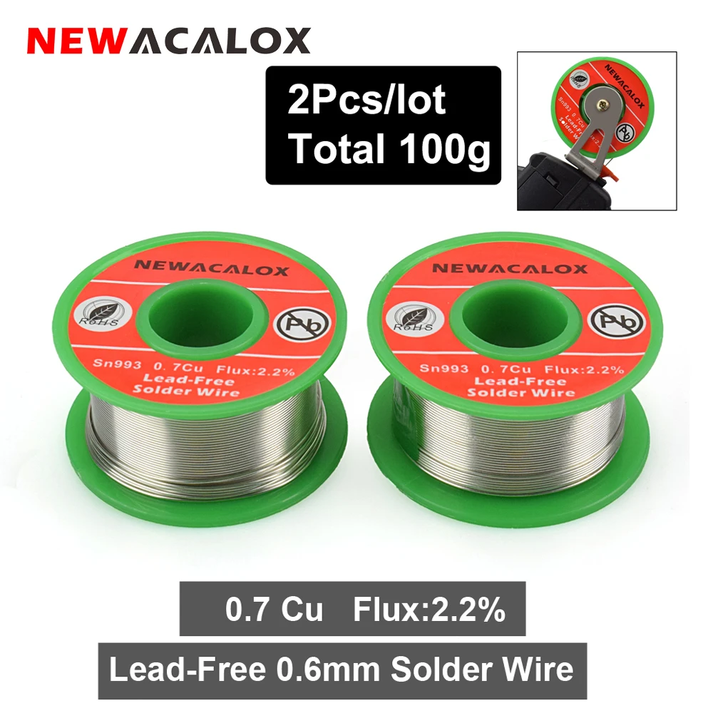 NEWACALOX 2 шт. 0,6 мм безсвинцовая Оловянная проволока, паяльная проволока Sn993 Pb007 Cu0.7 с флюсом 2.2%, канифольный сердечник, сварочная проволока, роликовый инструмент