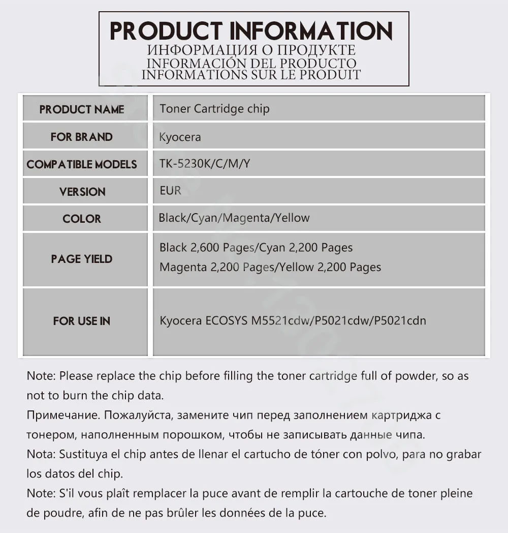 Chip For Toner cartridge codeTK-5230K/C/M/Y