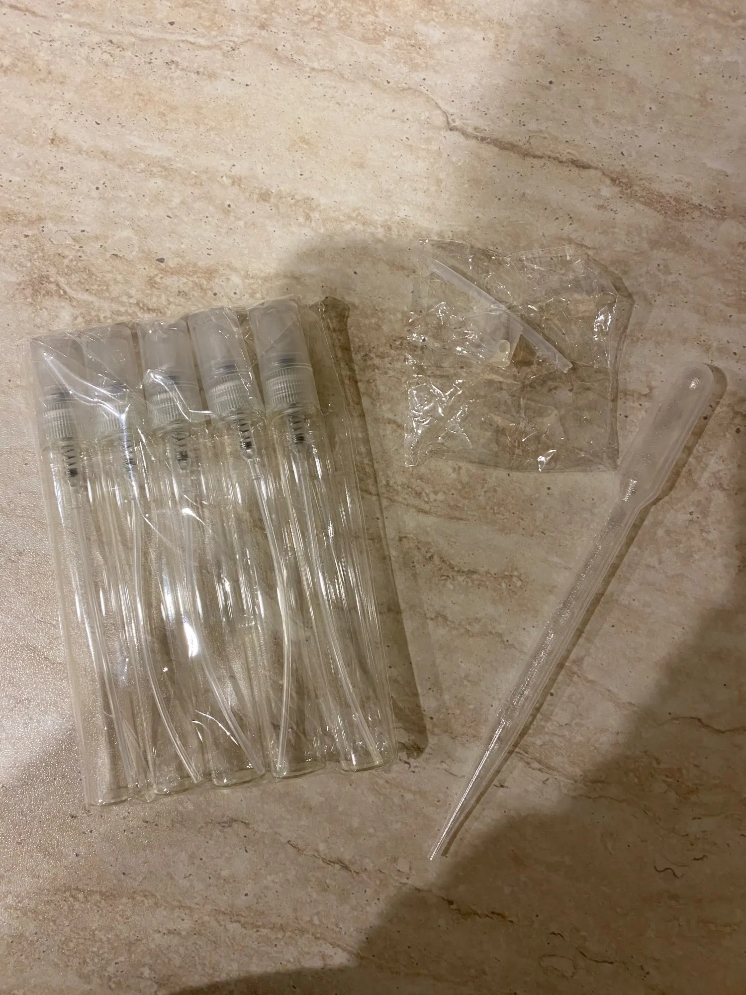 Приехало 5 флакончиков и один запасной пульверизатор и мерная пипетка. Флакончики из стекла. Покупала, чтобы перелить туда пробники духов. Работает как надо, разбрызгивает прекрасно, да еще и доставка молниеносная. Очень довольна этим заказом.