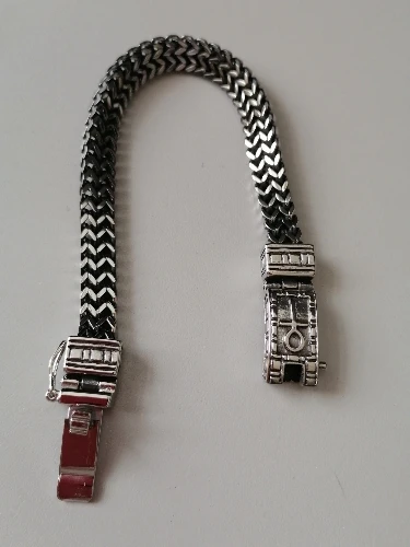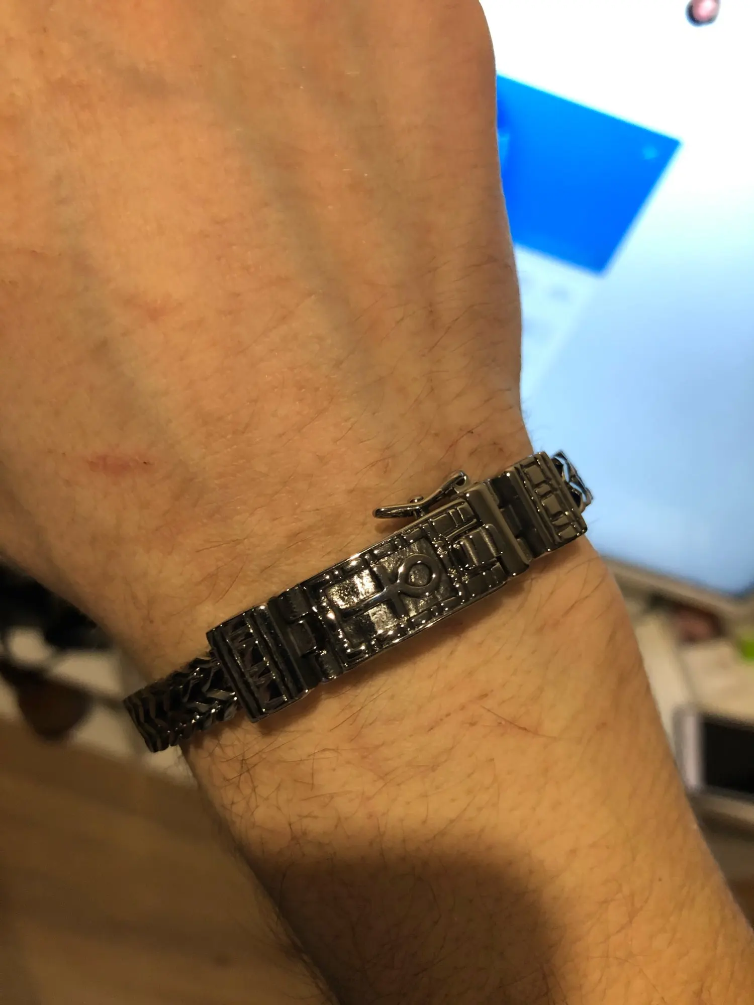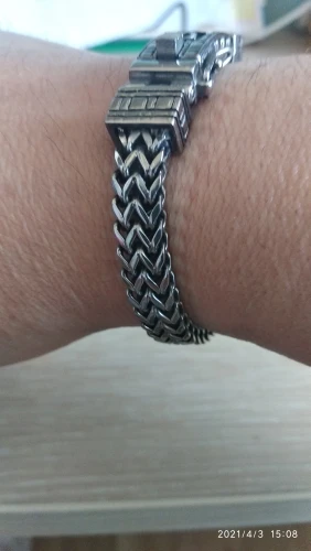 браслет очень качественный, по размерной сетке. Застежка-защелка страхуется ещё и навесной петелькой. На широкую руку даже на женщине смотрится аккуратно и стильно. Очень довольна. Отправили сразу, полностью отслеживались, пришел в Подмосковье за 10 дней. Рекомендую продавца и товар. Продавцу процветания и удачи!!!