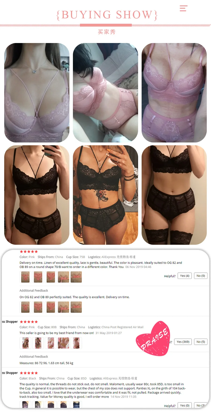 Бельё по качеству просто бомба! Как из дорогого бутика. Доставка 2 недели. Один минус - бюстик маломерит. Ношу стандартный 75В (ОГ 87, ОПГ 75), по сетке заказала 80В (всегда на Али его заказываю) , а он в обхвате тесноват. Застегиваю на последний крючок, но все равно не очень комфортно. Но грудь в нем смотрится просто Ах! Придётся удлинитель покупать. Труселя на ОБ 95 сели идеально. Однозначно рекомендую брать!!!