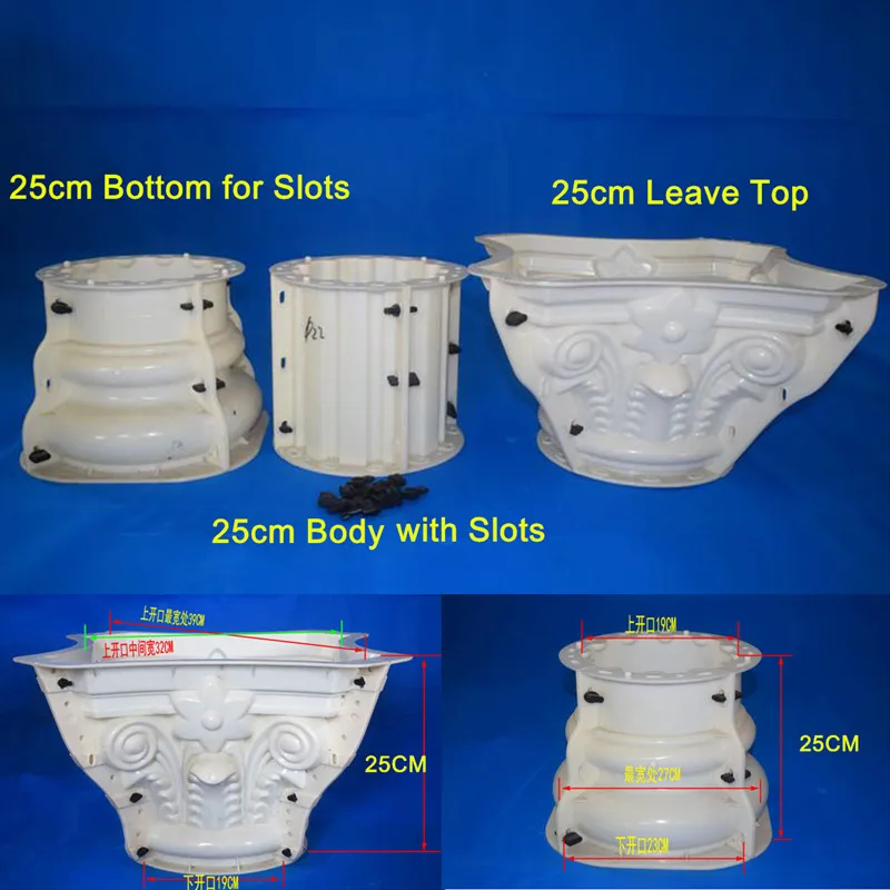 Высота: 250 см (обратите внимание, что это стандартная высота щелевой стойки, а обычная стойка-265 см)Высота: 200 см (225 дюйма, обычная Опора-см)Высота верха листьев: 25 см (верхнее отверстие: 39 см/15,35 дюйма, нижнее отверстие: 19 см/7,48 дюйма, вес: 1,7 кг)Высота дна: 25 см (верхнее отверстие: 19 см/7,48 дюйма, нижнее отверстие: 23 см/9,06 дюйма, вес: 1,4 кг)25 см корпус: 8 комплектов (1,12 кг/компл.)Примечания:1. 19 см-это внутренний диаметр формы.2. 1 комплект корпуса/верха/низа состоит из 4 частей формы из АБС-пластика.