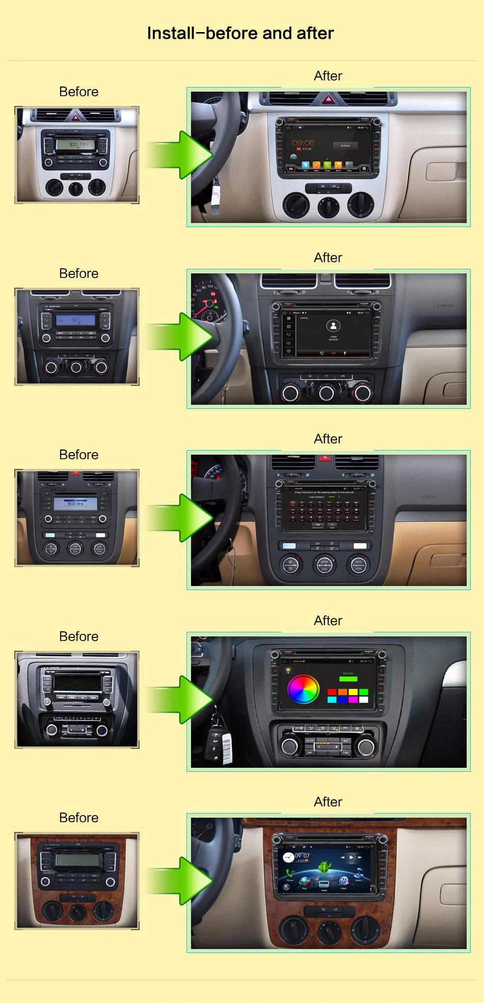 Для VW серии:Для Passat 2007-2015/для Tiguan 2007-2015/для Transporter T5 2010-2011/для Passat CC 2008-2015Для Touran 2003-2015/Для EOS 2006-2011/для Golf V 2003-2015/для Caddy 2004-2015/для Scirocco 2008-2015/Для Golf VI 2008-2015/для Jetta 2005-2015/для Bora 2009-2015/для Golf Plus 2003-2009/для Golf Mk5 2003-2015/Для New Polo 2010-2015/для Sharan 2010-2011/для Leon 2005-2010/для Seat Altea 2007-2011/Для Toledo 2004-2009/для Seat Alhambra 2010-2011Для Skoda Series:Для Fabia Limousine ab 02/2007 до 2012Для Fabia Combi ab 04/2007-2012Для Praktic ab 04/2007 до 2012Для Roomster ab 04/2006 до 2012Для Octavia Combi 06/2004 bis FaceliftДля Octavia Limousine ab 06/2004 bis FaceliftДля Octavia II 2 & III3 (не подходит для Octavia 2014-)Для быстрогоДля Yeti ab 2009 до 2012 (необходимо добавить рамку)Для превосходного 3 T ab 2008 до 2012Обратите внимание: Если вашему автомобилю необходимо добавить раму, пожалуйста, свяжитесь с нами перед отправкой.Для серии сидений:Для Seat Leon 200520062007-2012Для Seat Altea 2007,2008,2009,2010,2011Для сиденья Alhambra 2010,2011Для Seat Toledo 2004,2005,2006,2007,2008,2009