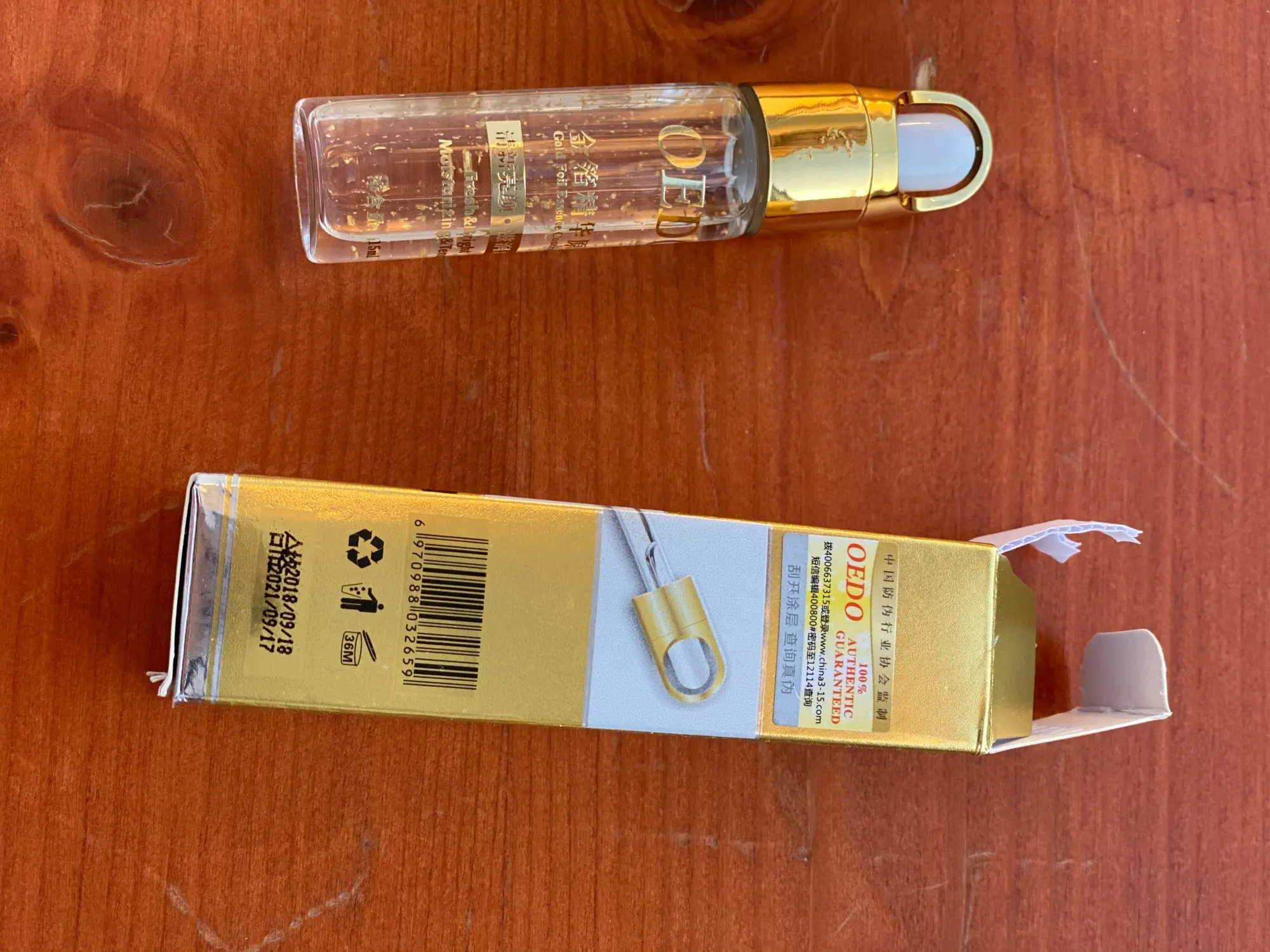 Купила за цент и монеты. Что не самый свежий срок выпуска уже не удивляет. Сама сыворотка не лучше и не хуже многих сывороток с Али. Увлажняет, предотвращает щелушение. Золотишко - это хлопья фольги. Запаха нет, точнее нет аромата, немного пахнет химией.