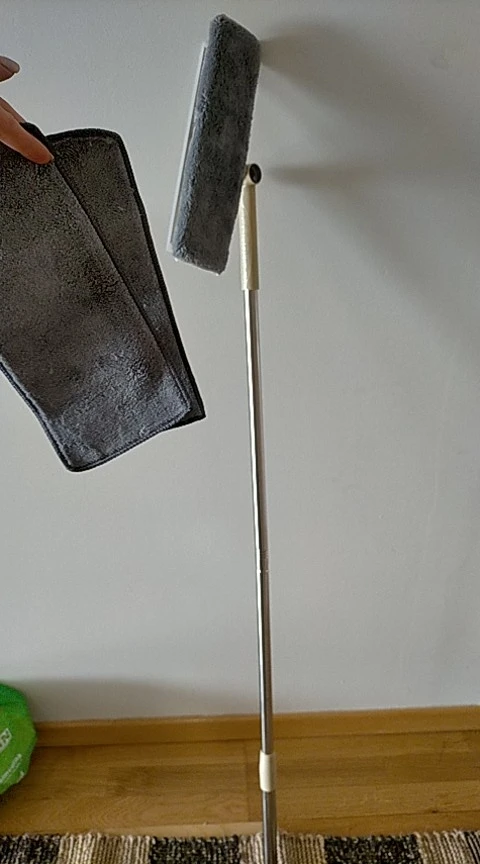 Удобно, что не надо вставать на стул или стремянку, тряпка оставляет разводы, не очень прочная конструкция. Доставка быстрая, курьером на дом.
