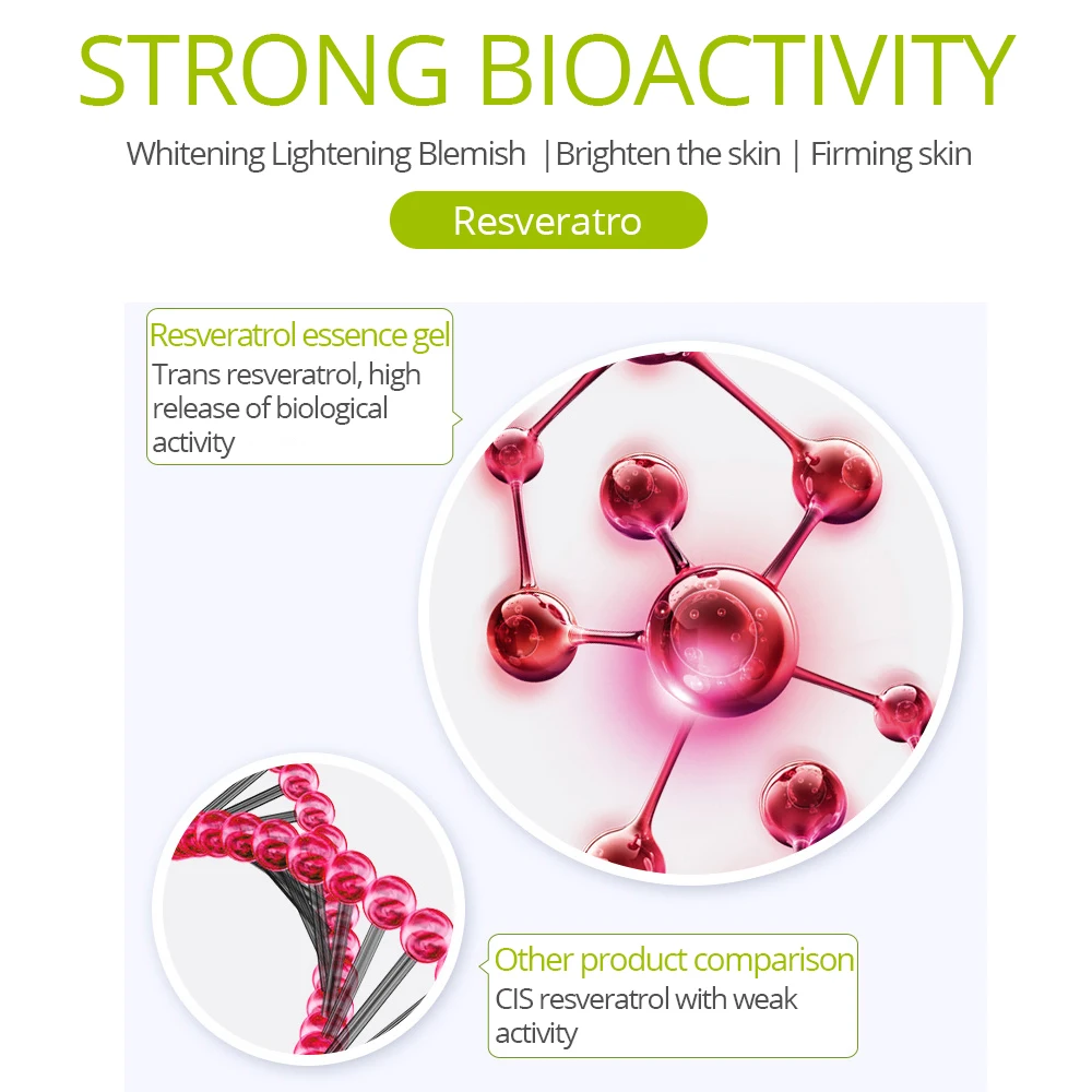 Сильная биоактивность Отбеливание, осветление недостатков Осветляет кожу Защита кожи Гель с эссенцией ресвератрола Транс-резвератрол, высокий выпуск биологической активности. Сравнение других товаров СНГ ресвератрол со слабой активностью.