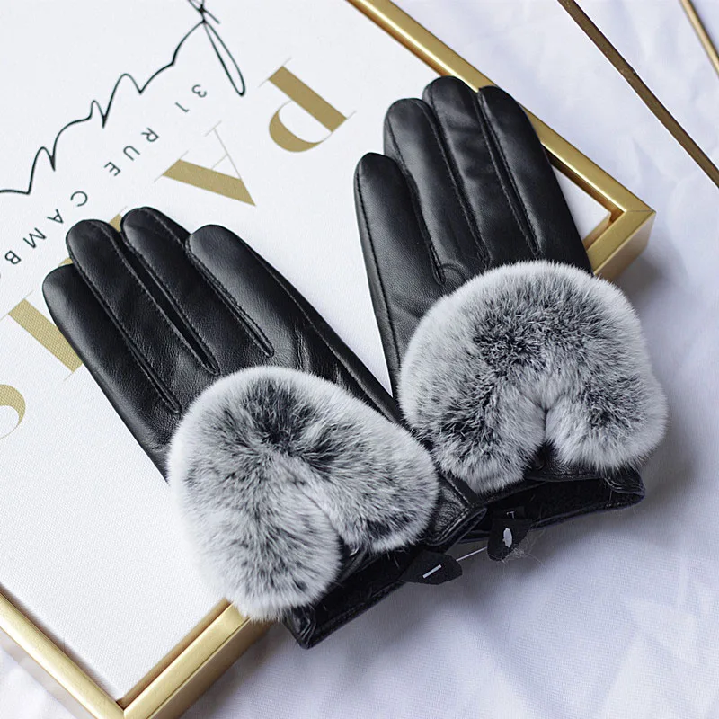 2021 Зимние перчатки для рук из натуральной кожи с натуральным кроличьим мехом Модные женские черные кожаные перчатки с меховым пальцем теплые руки