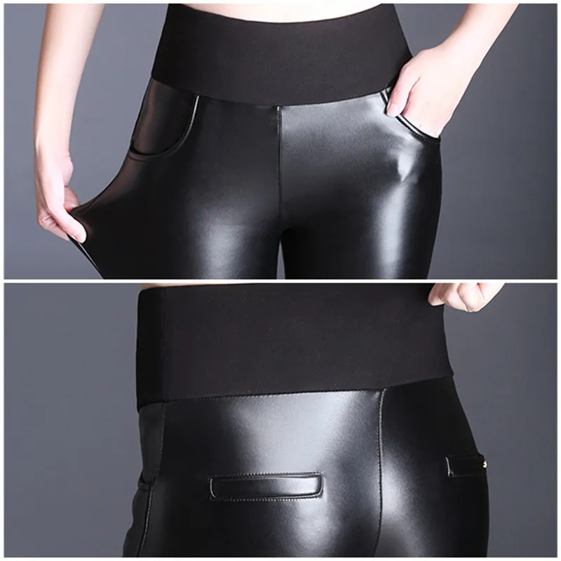 WKOUD зимние кожаные брюки с высокой талией утолщенные теплые брюки-карандаш облегающие высокие Стрейчевые леггинсы женские брюки искусственная кожа P8569