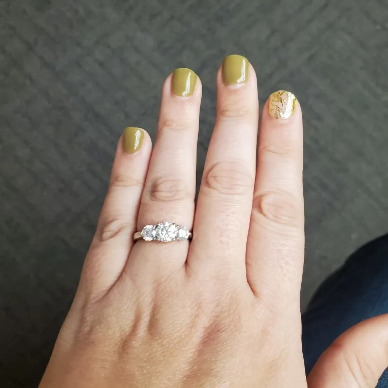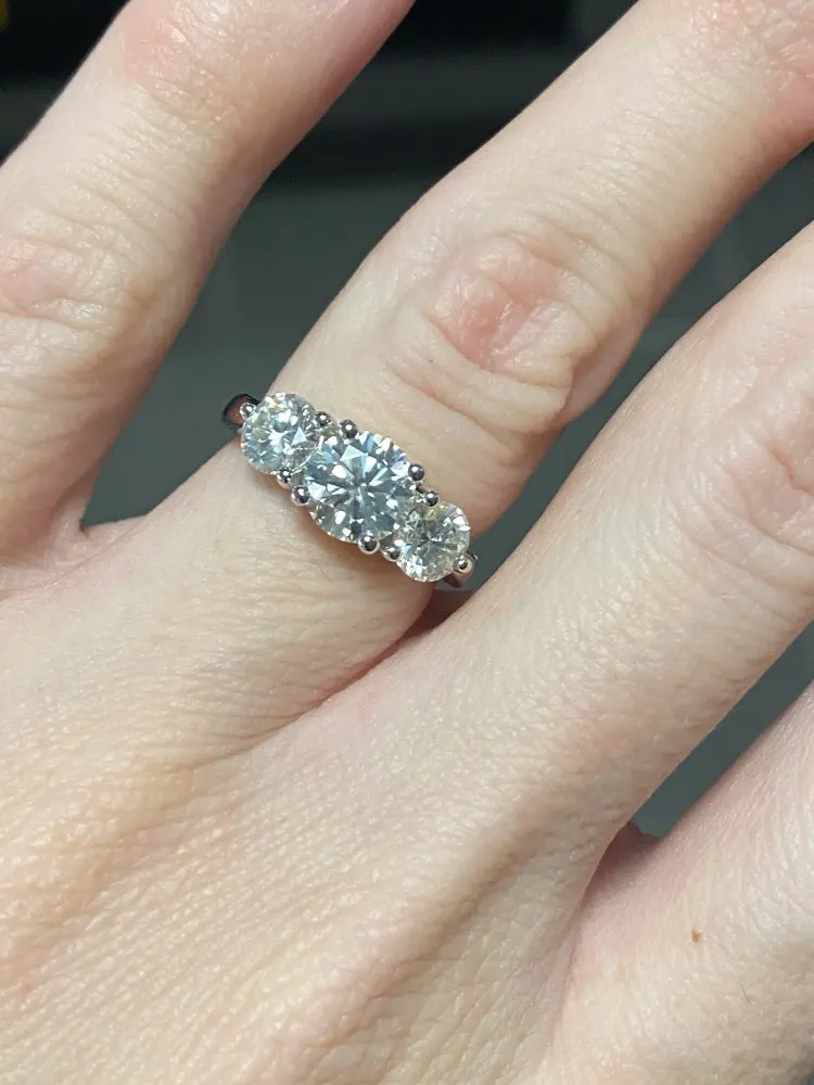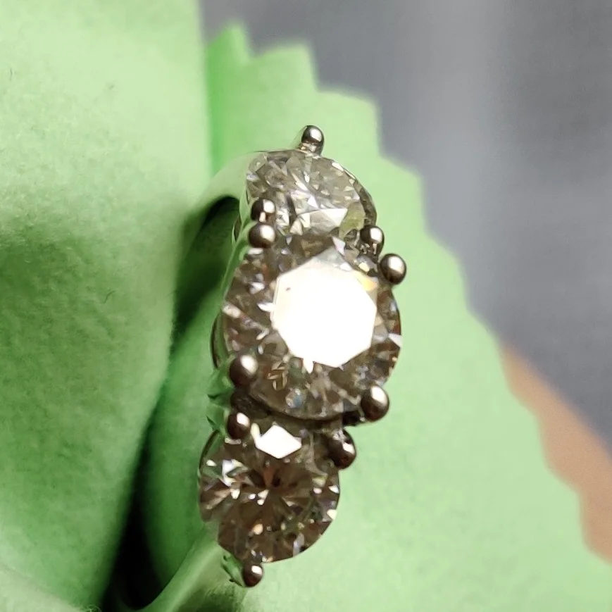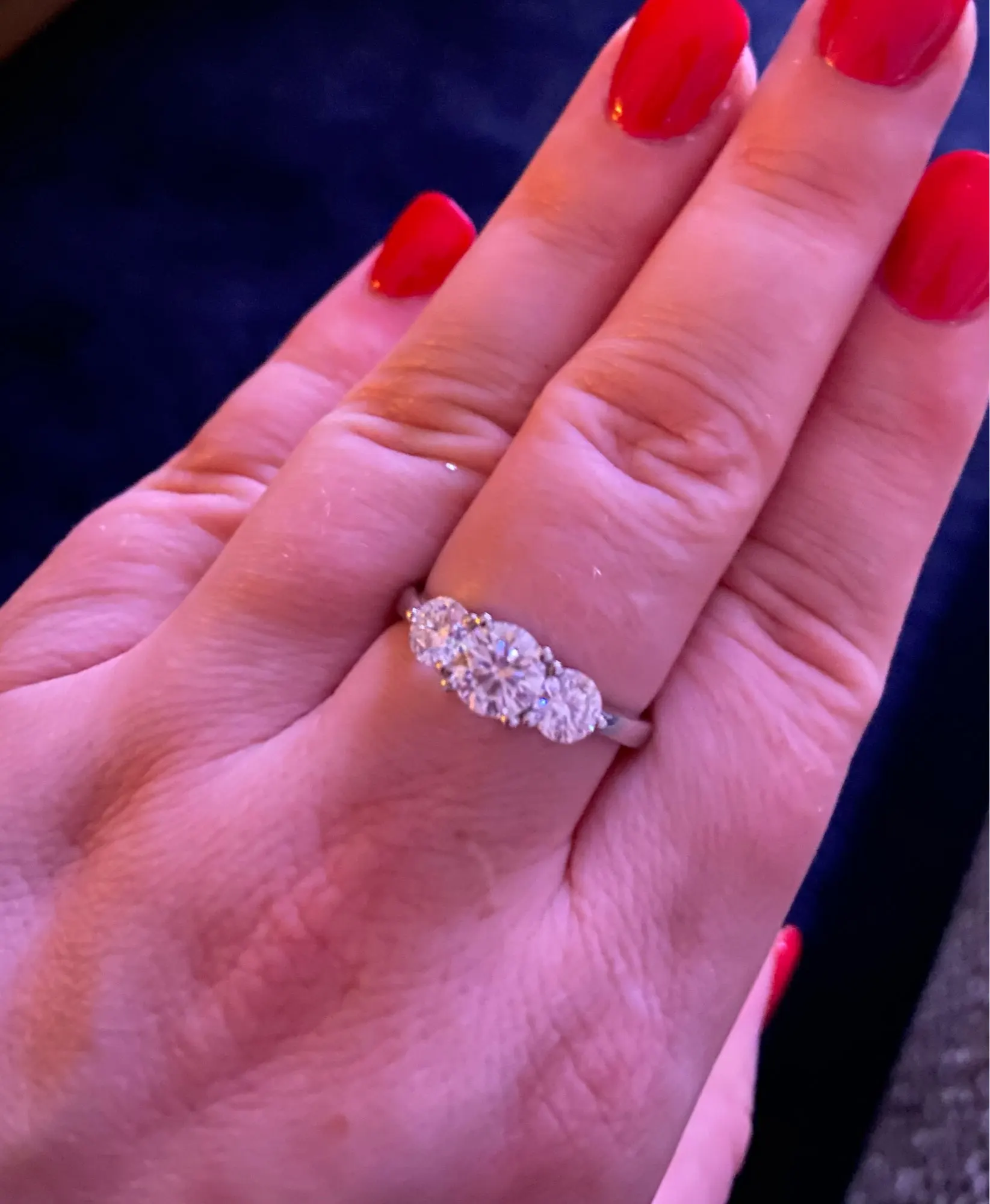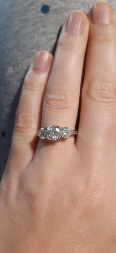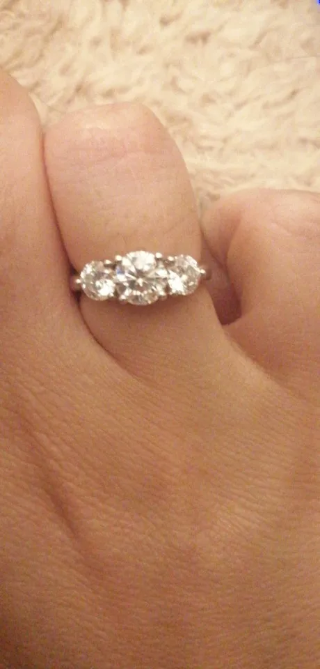 Кольцо было красивым, когда оно прибыло. Камни сверкают и загораются. Я получил много комплиментов от людей. Центральный камень-1 карат. Боковые камни 0,5 карата. Я не был впечатлен металлом, поэтому я связался с продавцом, и они нам очень понравились. В следующий раз я добавлю еще немного денег и куплю это в белом золотом