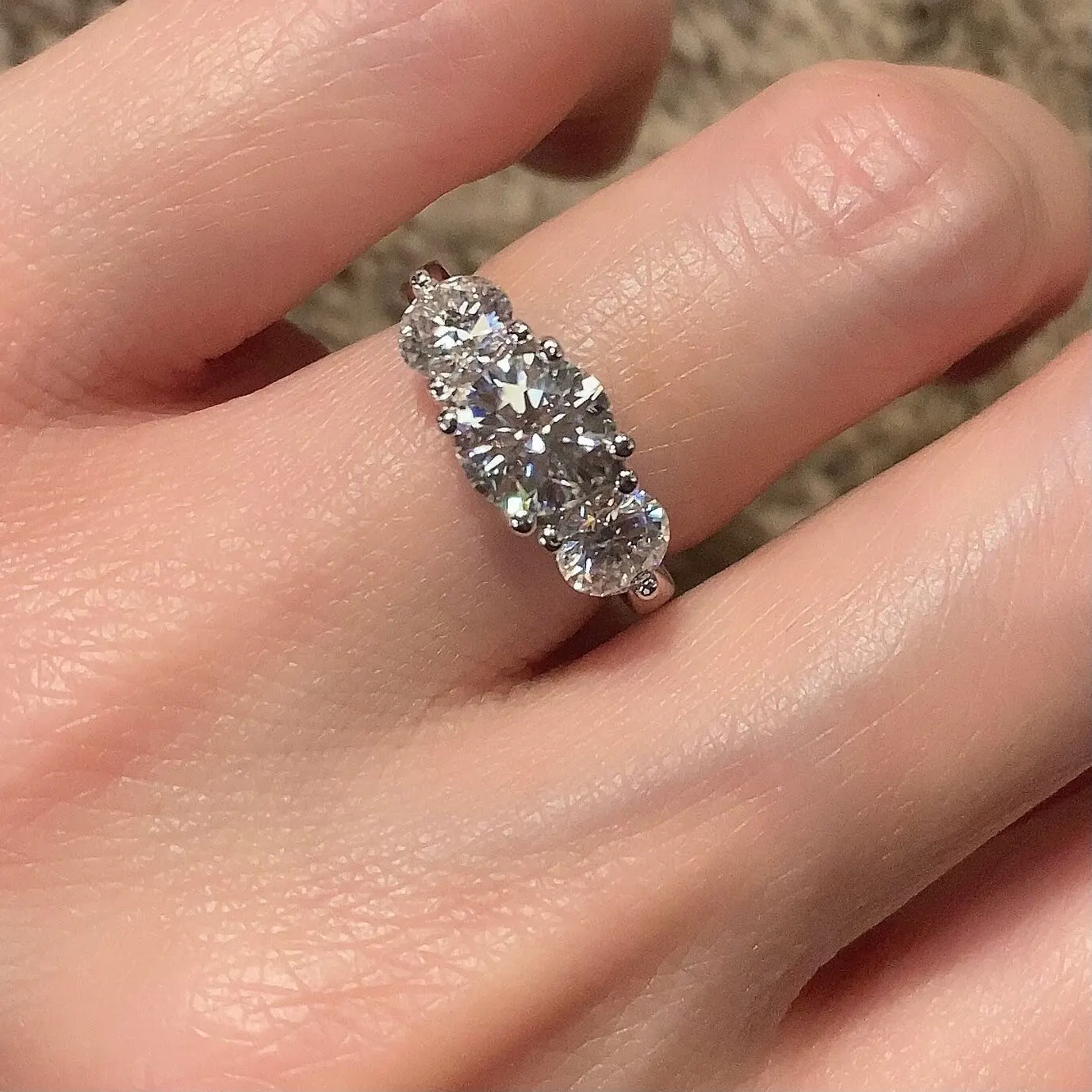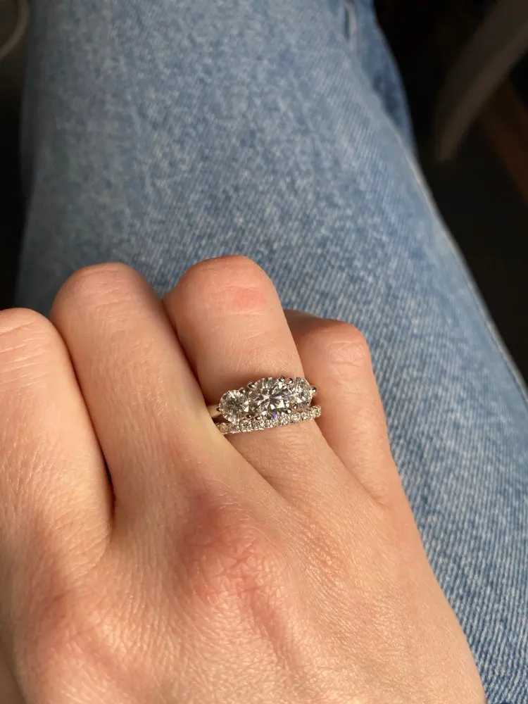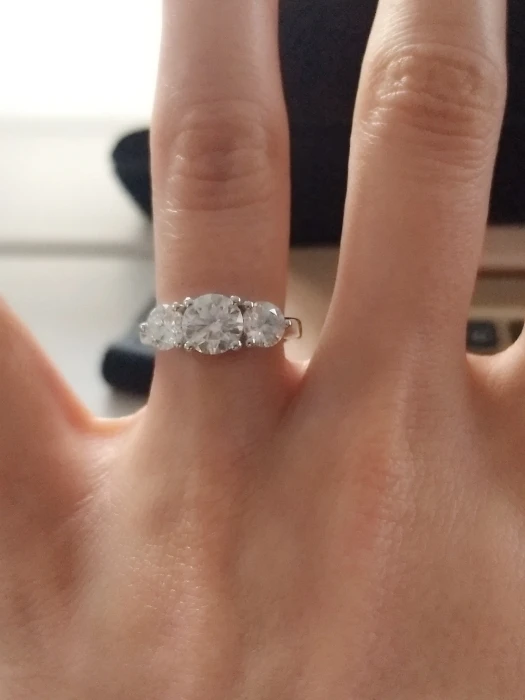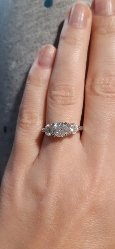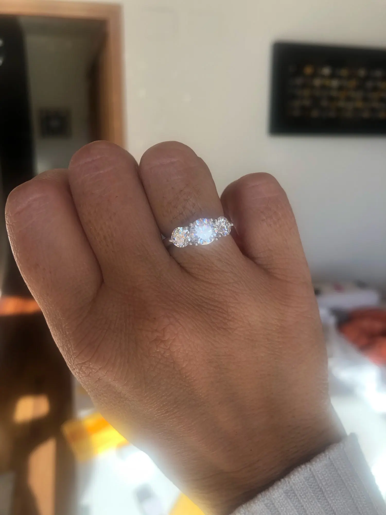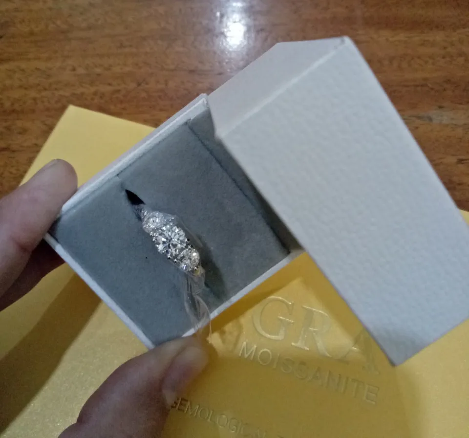 Отличное мастерство, кольцо очень гладкое и камень правильно закреплен. Точный размер кольца. Моиссаниты красиво сверкают, особенно в комнатном освещении. Все еще различимы из настоящего алмаза, они очень красивые. Поставляется с сертификатами GRA. Носите его и проверьте, потускнеет ли металл. До сих пор я бы порекомендовал этого продавца.