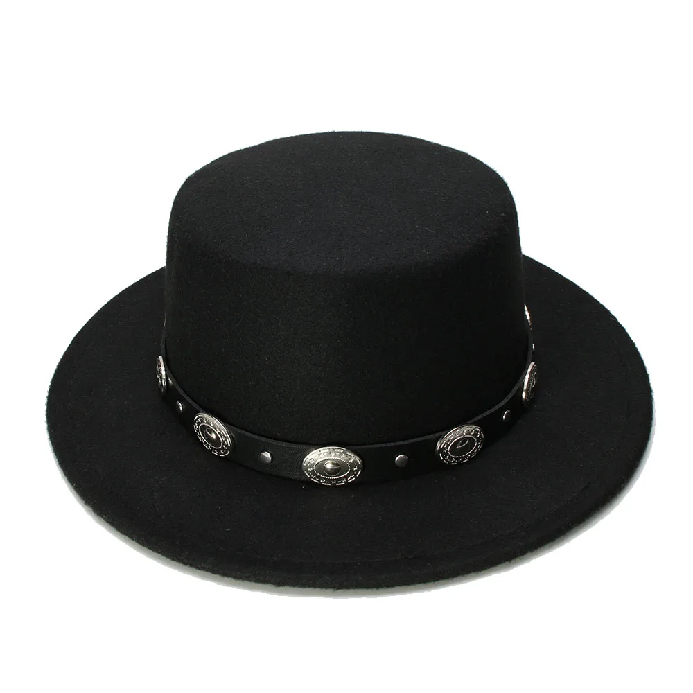 LUCKYLIANJI, женская и Мужская винтажная Кепка из 100% шерсти с широкими полями, Кепка-котелок в виде свиного пирога, котелок в стиле панк, кожаный ремешок с бусинами из сплава (57 смрегулируемый)