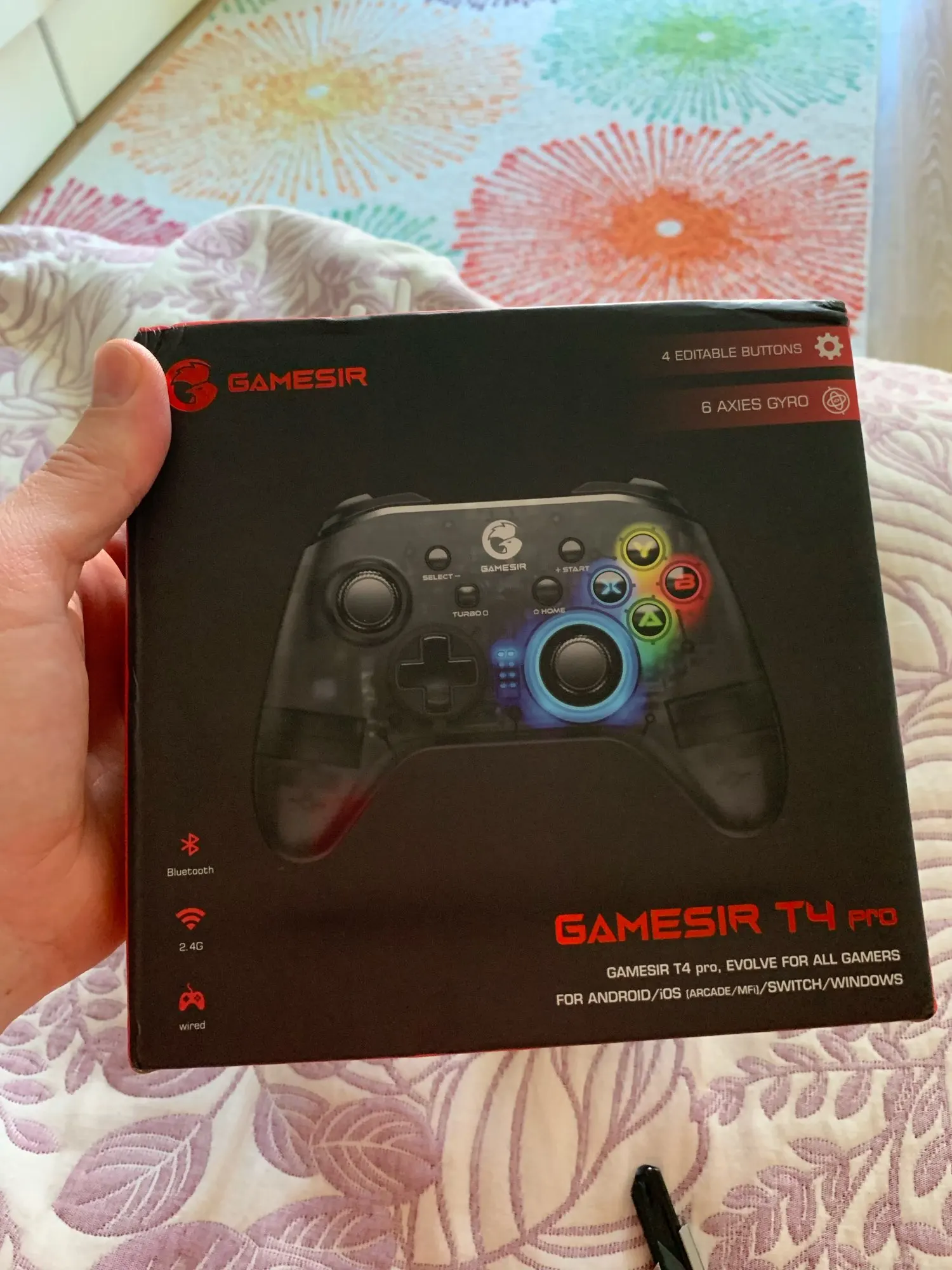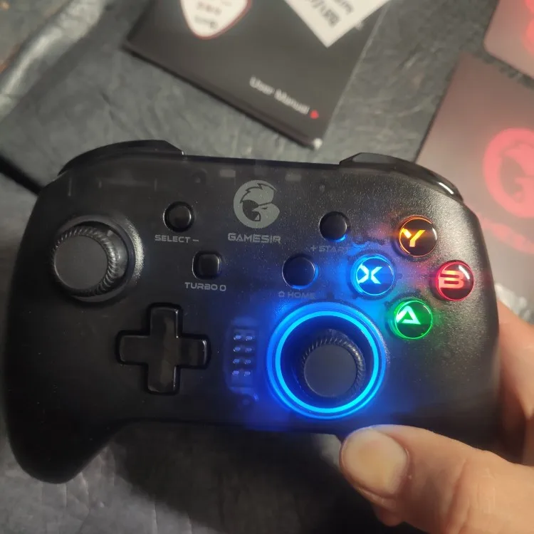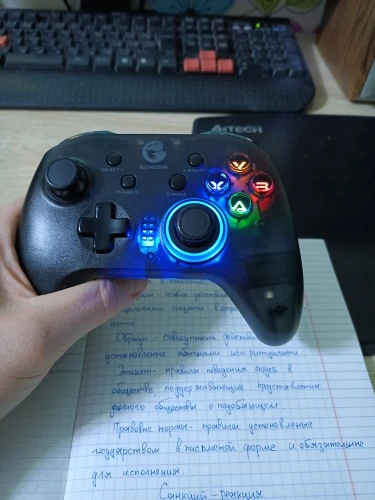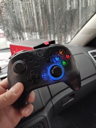 За свою цену геймпад отличный. Без прблем одключается к anroid и pc. При подключении к ПК (по wifi) определяется, как контроллер Xbox 360, то есть изначально гироскоп не работает, чтобы он заработал, нужно подключать через bluetooth или настроить всё самостоятельно. В икомплекте дёт: геймпад, провод для зарядки, держатель для телефона, wi-fi свисток, наклейки Gamesir и документация. Задержек не замечал. Стики, полупрозрачный корпус, кнопки, всё нравится, у меня в руках лежит удобно. Кроме крестовины, нажимая в одну из сторон, может нажать кнопка рядом. Сзади геймпада есть 4 доп. программируемые кнопки, в интернете пишут, что это неудобно, т.к. они случайно нажимаются, но не у меня. Подсветку кнопок с буквами можно отключить. Регулируется сила вибромоторов (+можно выключить). Заказано 26.11, пришло 03.12, хотя было написано, что придёт 06.12. В итоге время доставки - 8 дней, очень быстро. В общем всё понравилось, за эту цену отличный геймпад.