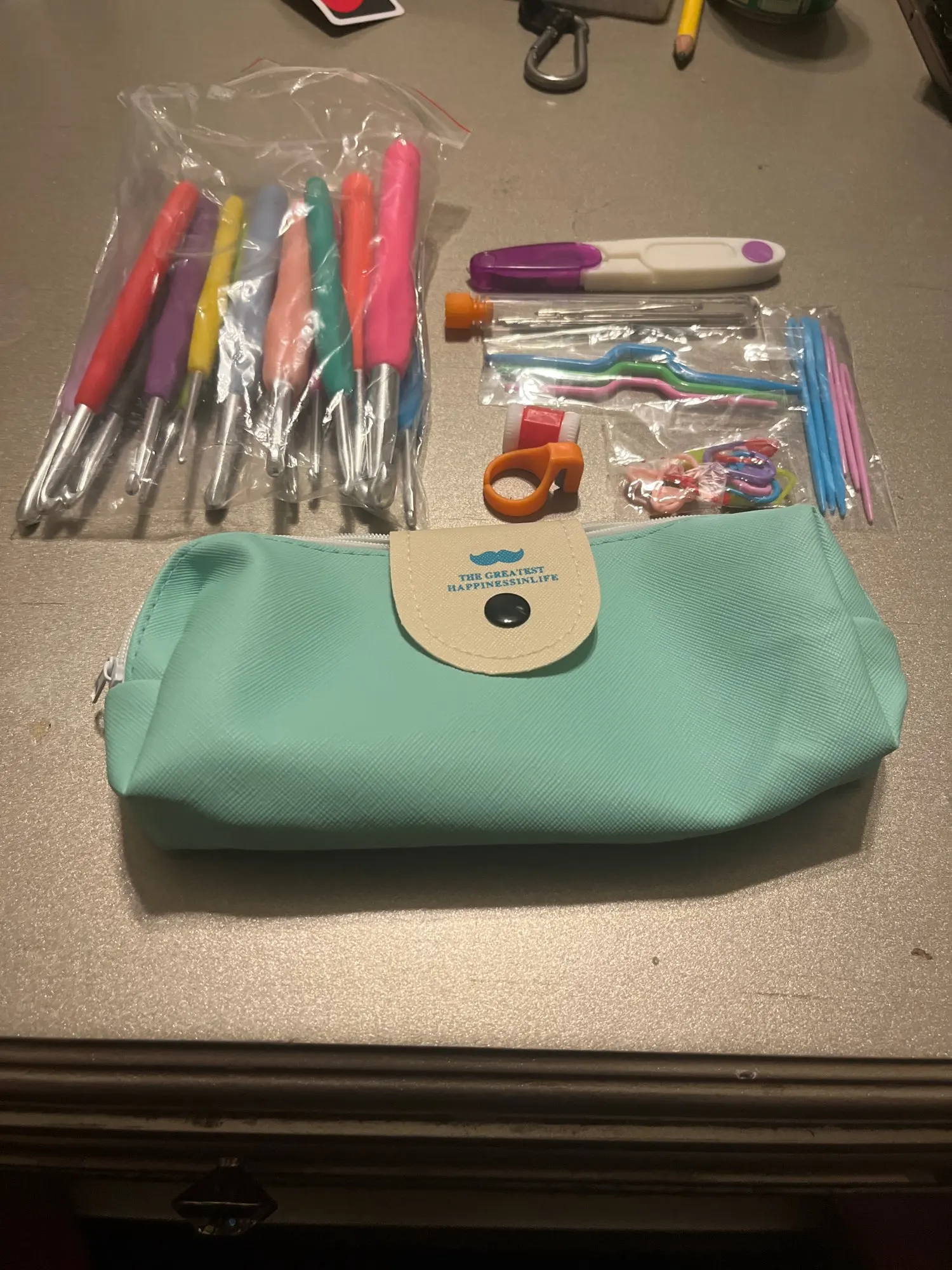Шло 2 месяца! Думала, что не увижу. И... О ЧУДО! Аккурат в день рождения получила. Сам набор шикарный! Чехол аккуратный, приятный на ощупь. На крючках номера тисненные, не сотрутся. Вся остальная мелочевка тоже порадовала. Все аккуратное.