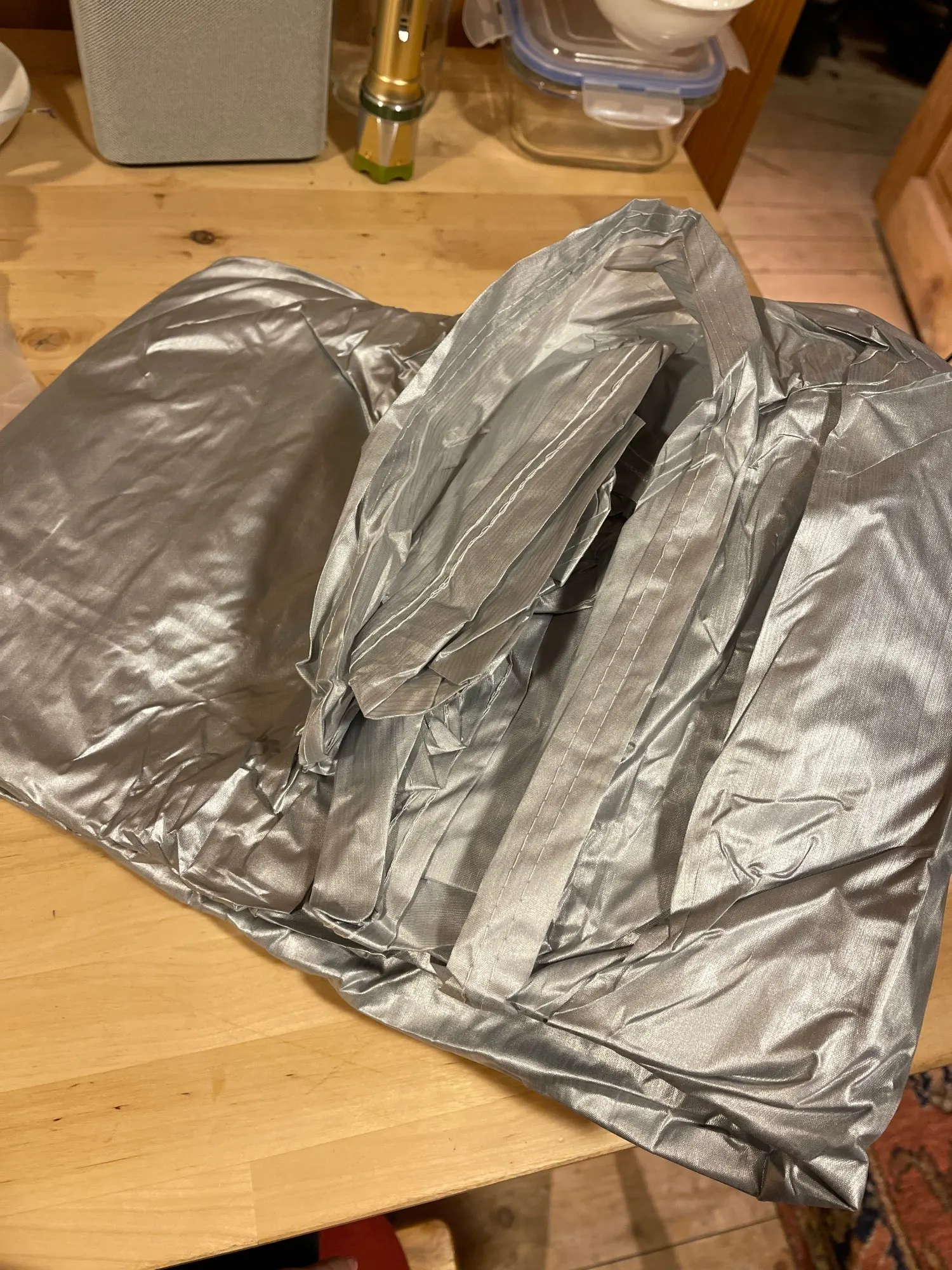 Чехол разочаровал. В основном конечно размерами. На Калину хэтчбэк с длиной 3.9м брал чехол 4,15м. думал с запасиком. В реальности жопа голая. Чехол доходит только до крышки багажника, то есть задний бампер голый и в таком положении чехол не держится несмотря на резинку. Кармашки под зеркала оказались бесполезными, так как попытался более менее отцентровать чехол на машине и они оказались уже не на своих местах. Кое как сделал. ушёл. Пришёл позже. чехол валяется рядом с машиной. Ветром сдуло. Ладно забор есть. а то куда бы удуло неизвестно. Придётся видимо груза привязывать. пока снегом не засыпет. Как-то так. Надо было брать 4,50 по ходу.