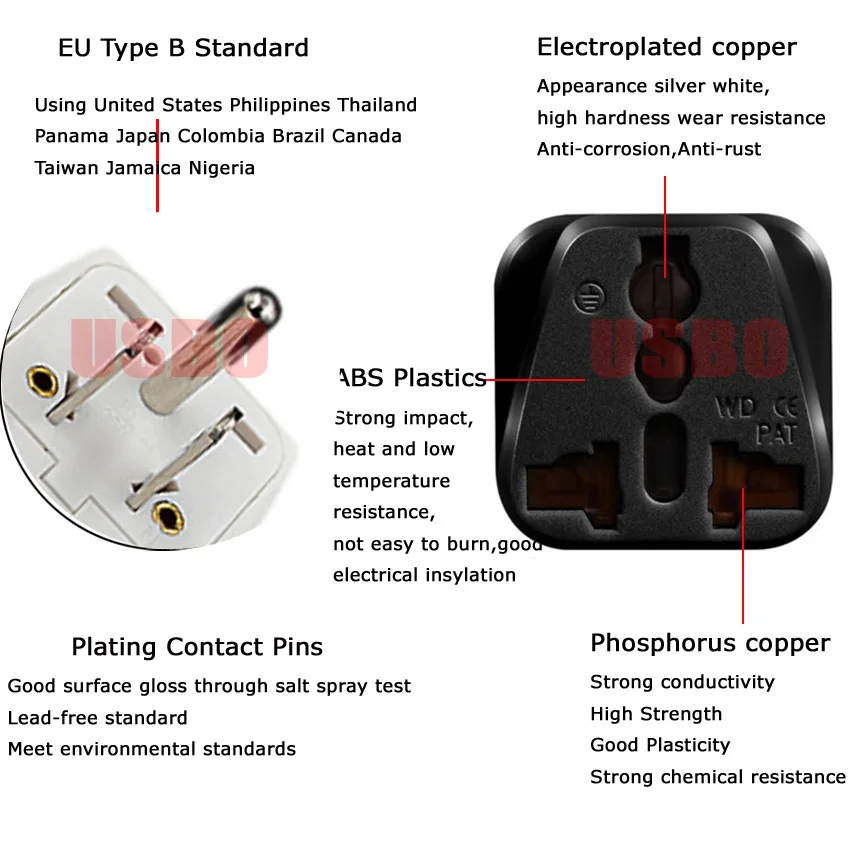 Сила у вас под рукой Используется в основном в США, Японии, Канаде, Таиланде. Используйте этот Универсальный Переходник типа 3 в 1 для преобразования ваших потребностей в питании. Компактный для легкого путешествия Этот Тип 3 в 1 Универсальный Переходник мал по размеру и светильник по весу, благодаря тому, что вы используете в любом месте по всему миру ваших поездок может занять у вас. Совместим с преобразователями питания и устройствами с универсальными источниками питания Многие устройства обеспечивают диапазон напряжения 110-240 В. Этот тип универсального штепсельного адаптера адаптируется только к стилю штепсельной вилки, а не к напряжению. Адаптер должен использоваться только с преобразователями питания или устройствами с универсальными источниками питания. Ограниченная пожизненная Гарантия USBO обслуживает миллионы клиентов более 10 лет, и каждый продукт поставляется с ограниченной пожизненной гарантией. Если вы не полностью удовлетворены своей покупкой, обратитесь в нашу опытную и специализированную службу поддержки клиентов в Китае для 24 часов в день, 7 дней в неделю. Для получения дополнительной информации см. Веб-сайт USBO. Технические характеристики Тип: универсальная американская японская штепсельная вилка типа B (принимает Тип A-O) Напряжение: 110-250 В Ампер: 10 А макс