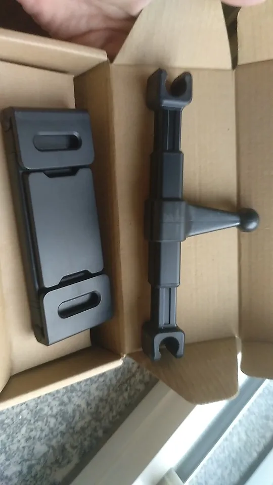Доставка быстрая, за 10 дней. Заказ опять пришёл в пятёрочку. Очень удобно и быстро. Крепление держателя вставляется в подголовник сиденья. Распорка металлическая, с прорезинеными креплениями. Сам держатель из пластика. Телефон держит плотно, планшет не пробовала вставлять, хотя приобретала с расчётом на него тоже. Как установим в машине, дополню фото.