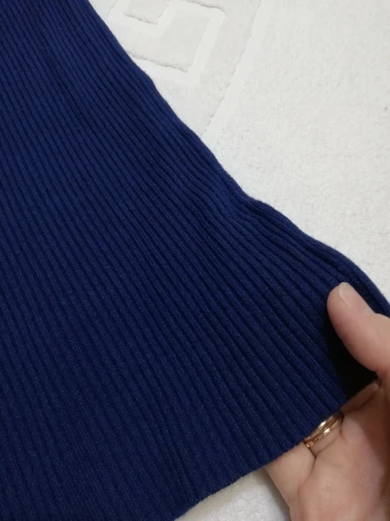 В принципе, водолазка хорошая. Приятный материал к телу. Ни каких этикеток нет, по составу не могу сказать, что за ткань. Цвет насыщенный - синий. Ширина 28 см, длина от плеча до края 55 см. Длина рукава от шва до края 51,5 см. Тянется в ширину хорошо. Нитки торчат на шве воротника, но это поправимо. Товар рекомендую к покупке, девушкам не более 55 кг, будет очень короткая. У меня вес 50 кг. Мне коротковато, хотелось бы длиннее. Но если заправлять в джинсы с высокой талией, будет хорошо. С продавцом не общалась.