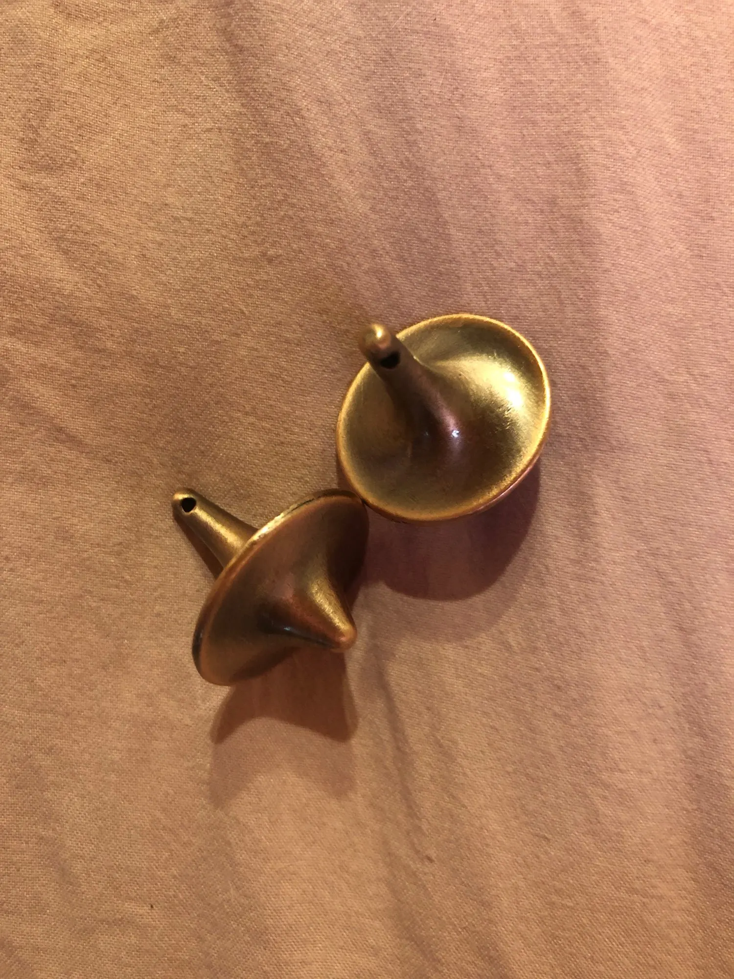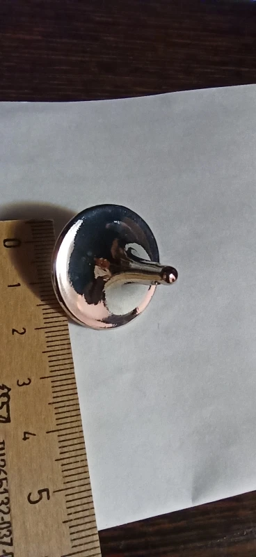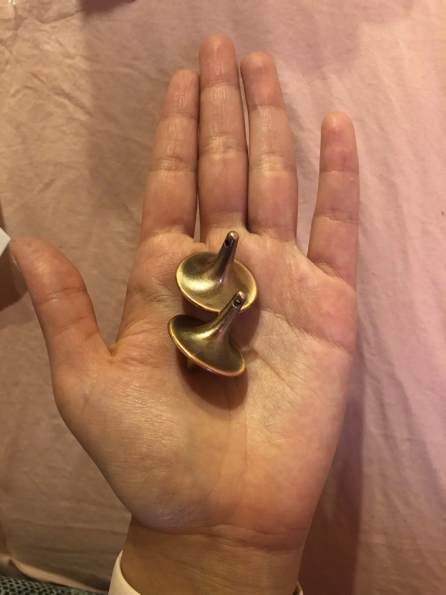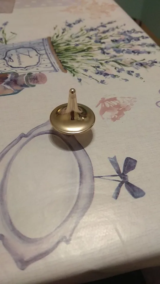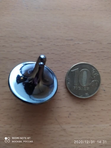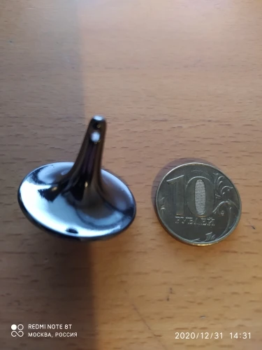 Заказал волчок 23 октября, продавец отправил товар 26 числа. В Хабаровск пакет пришёл 23 ноября. Волчок стальной, с покрытием под медь и покрыт бесцветным лаком. В целом выглядит неплохо, есть небольшие царапинки на лаке. Но и цена не бог весть какая, брал за 90 рублей. С продавцом не общался,не было необходимости. Игрушка забавная, но несколько не сбалансированная, при вращении ось слегка колеблется, что видно на пятой фотографии.