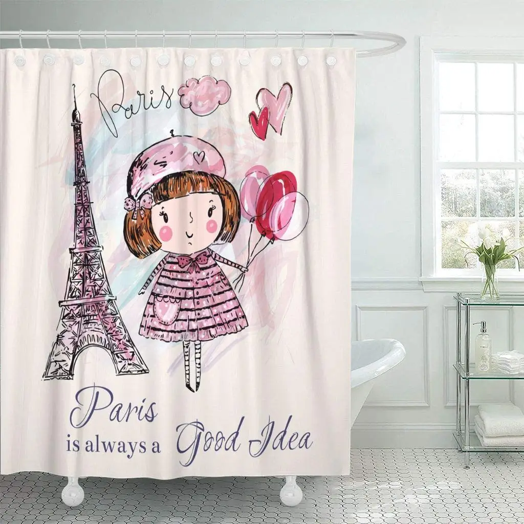 Занавеска для душа с крючками акварельный рисунок с башней Париж маленькая девочка во французском художественном воздушном шаре городской ванной комнаты