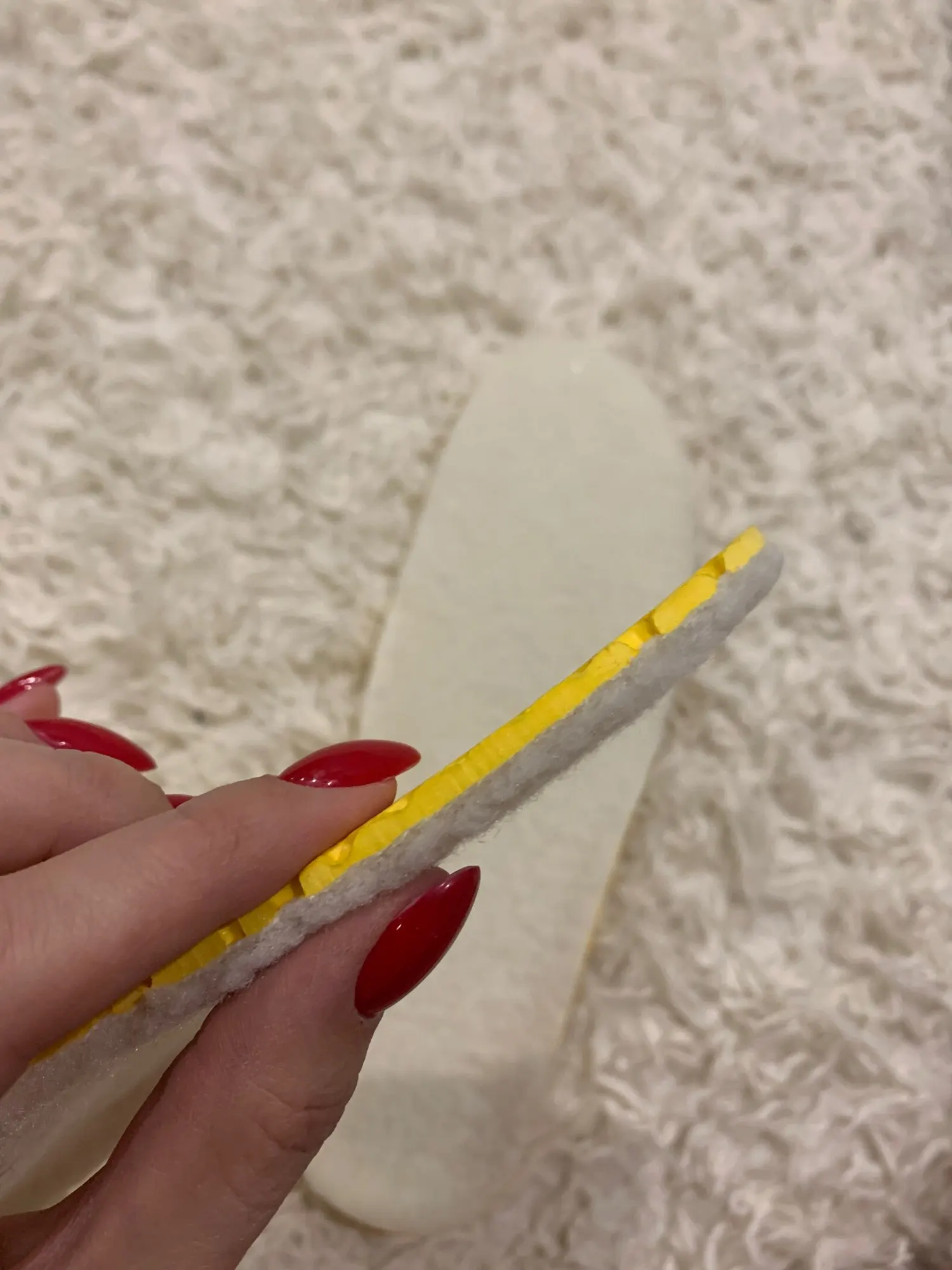 Доставка быстрая. Стельки хорошие, прибавляют в росте на один сантиметр :-) Мех чебурашки из акрила, от огня оплавляется и превращается в пластмассовый шарик. Но при этом ступням ног тепло и мягко. Благодаря сотовому жёлтому основанию из ЭВА создающему воздушную подушку. Считаю хорошей покупку на зиму.
