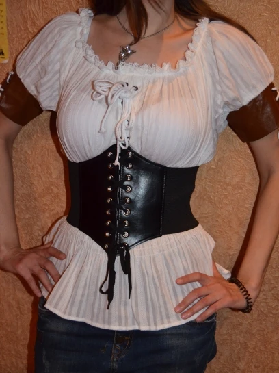 ЭТО ПРОСТО ОТВАЛ ВСЕГО, если у вас тонкая талия, то особенно. Любая футболка или рубашка длинная (миниюбка какая-нибудь) и этот корсет. Все, вы восхитительны. Шло довольно долго, но того стоит, просто кайф. На свою талию в 62 великоват, но если затягивать до отказа, ло очееь очееь даже. Под кожаной частью потно очень ( либо просто я потливая), однако вообще ничего не сдавливает