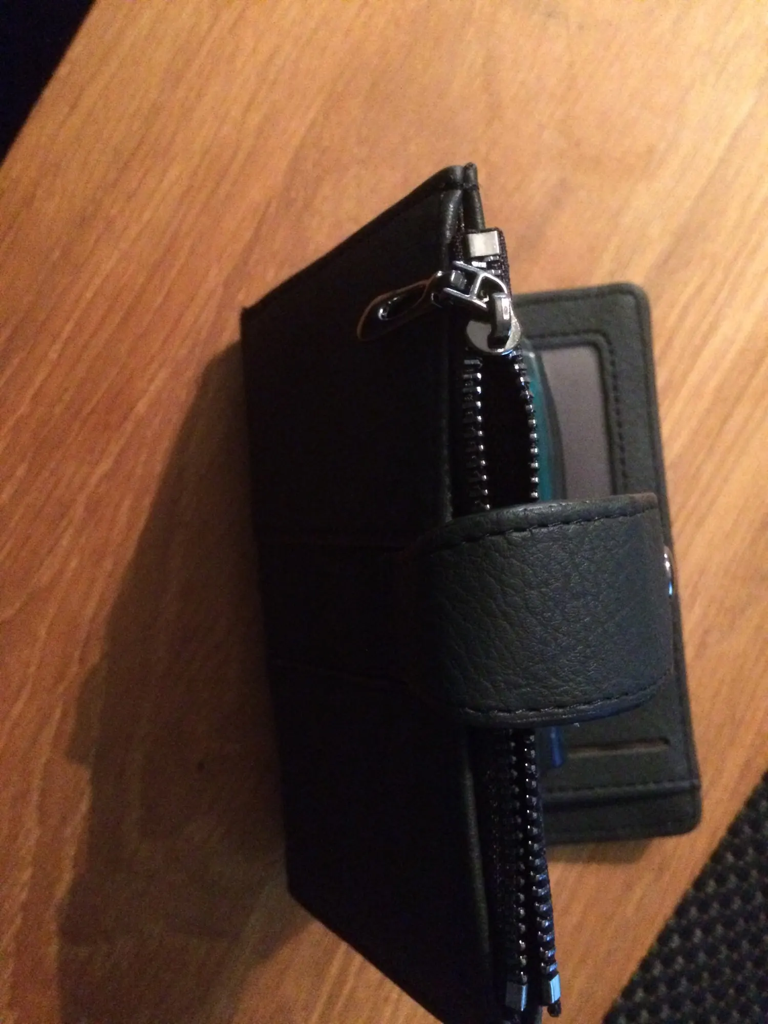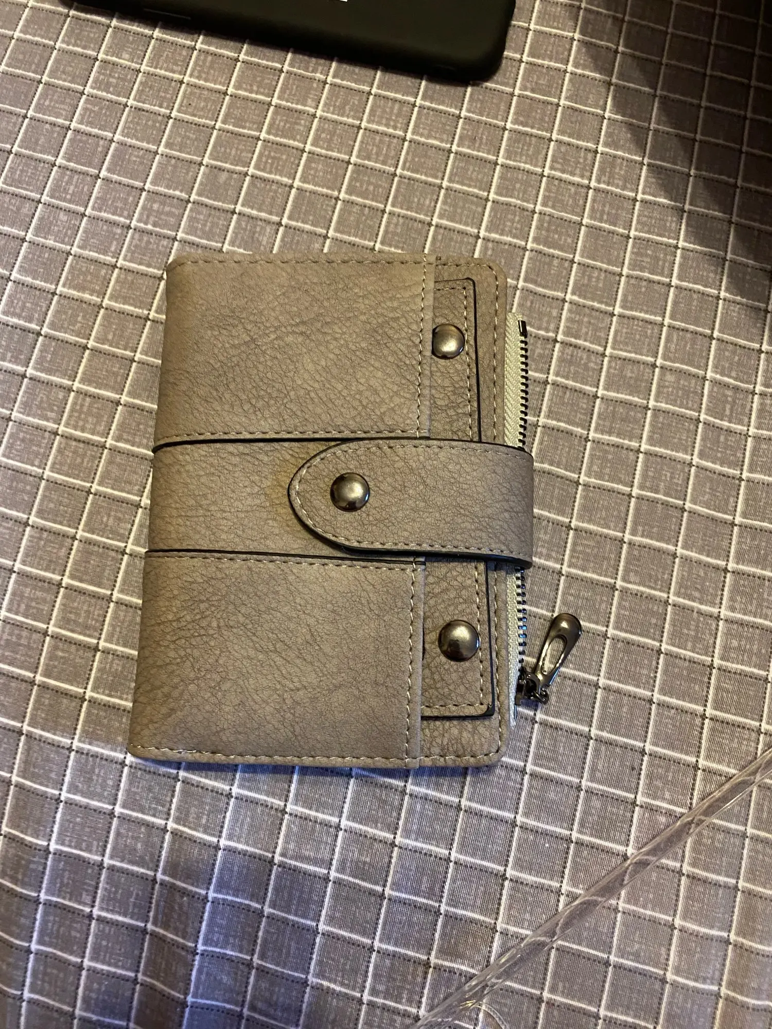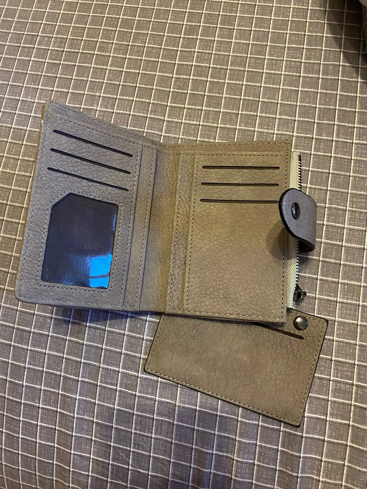 el color me ha decepcionado un poco , no es el gris de la foto ,es como un marrón caqui . La puerta donde he echo la foto es gris y se ve la diferencia del color. Por otro lado el monedero se ve de calidad para el precio que tiene.