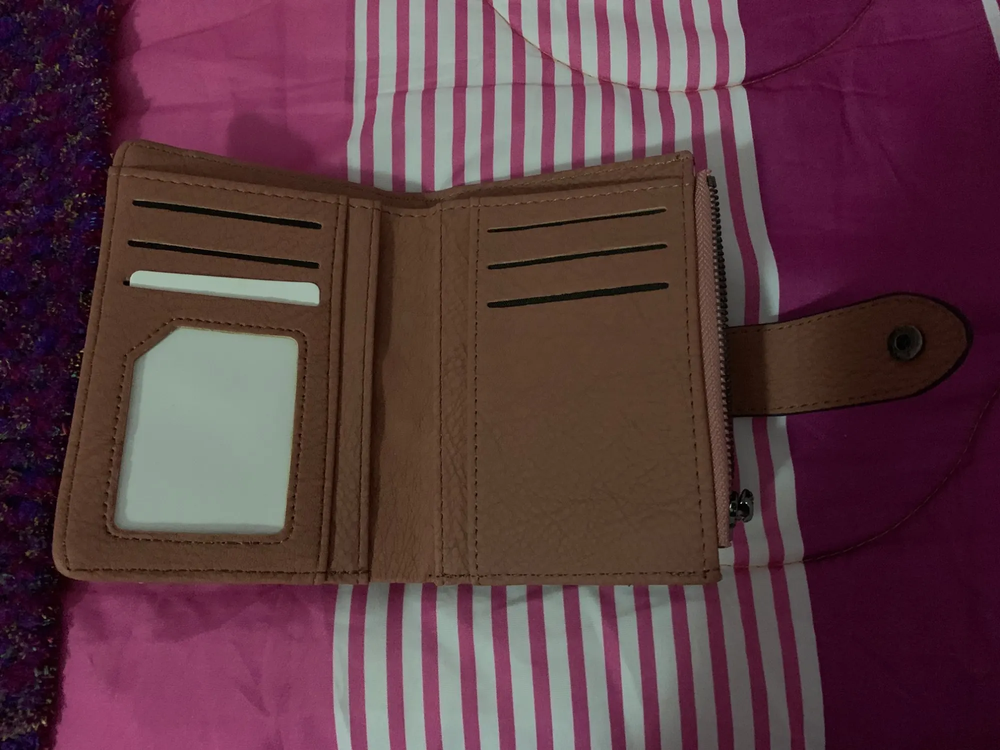 Очень красивый кошелек и много отделений. Я пользуюсь им уже несколько дней и никаких проблем.