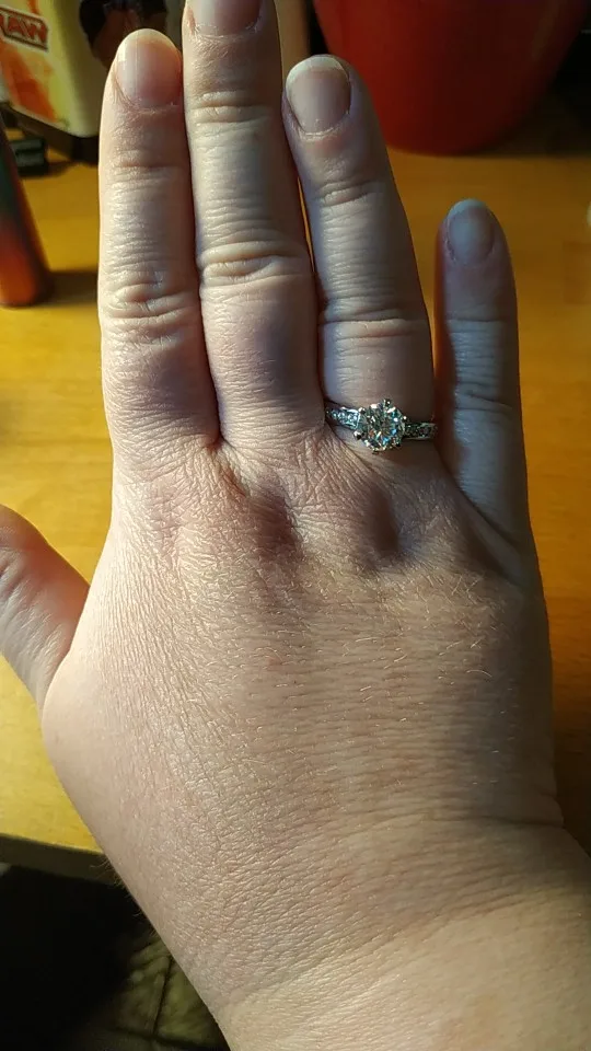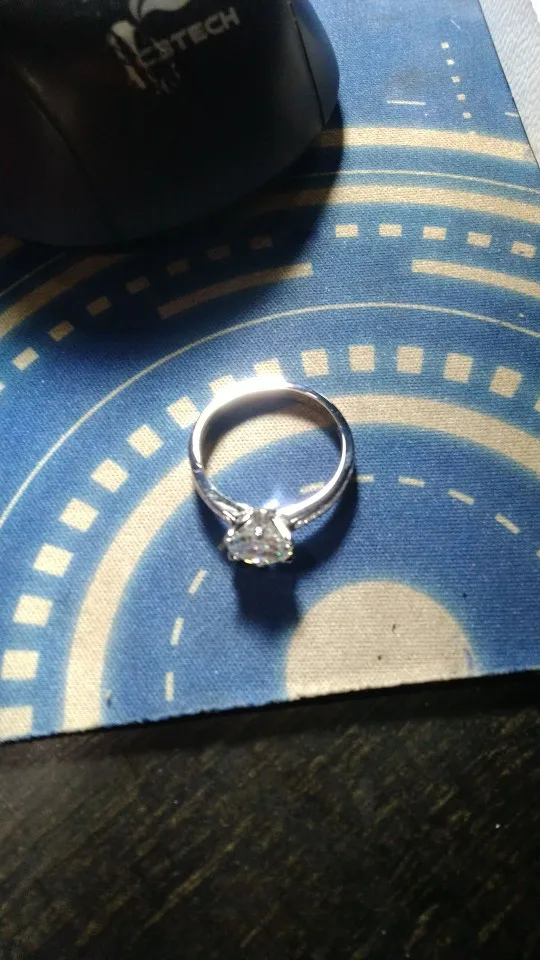 Потрясающий блеск! Сравнила с моими натуральными бриллиантами- сверкает, как настоящие! только, я рекомендую помыть под струёй воды с мыльной щёточкой, т.к. камень немного в налёте. Сертификаты и приличная коробочка тоже прилагаются! От белого золота не отличить.