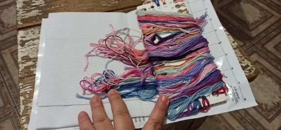В наборе оверложенная канва, нитки, 2 иголки, двухсторонняя цветная схема. Нитки мулине приятные на ощупь, с небольшим запахом, выветривается. Схема удобная, легкочитаема. Всё нравится. Большое спасибо за набор.