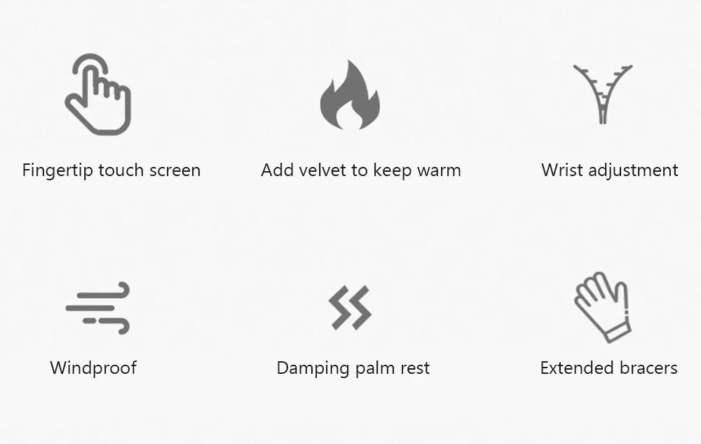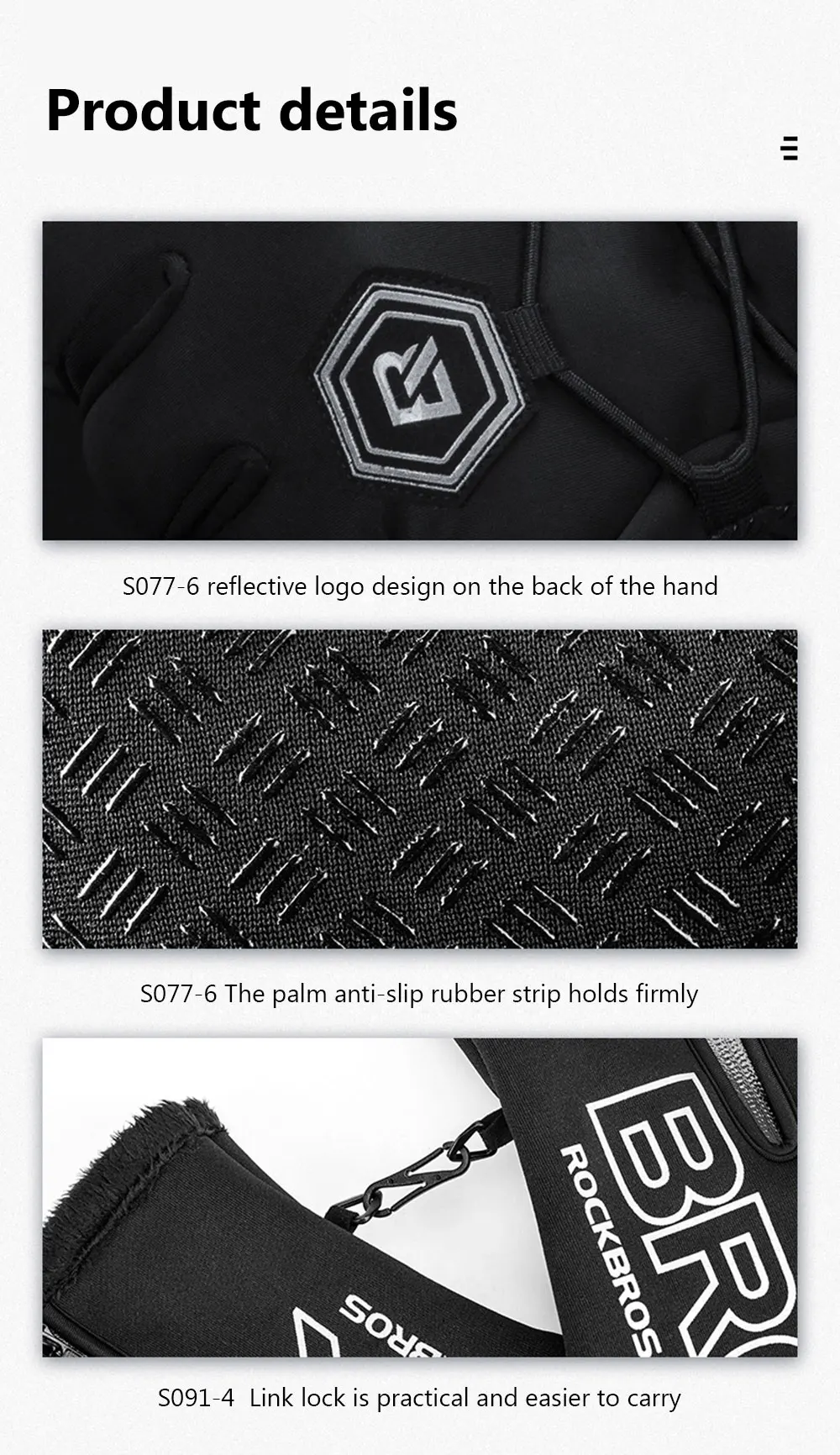 Бренд: ROCKBROSМатериал: бархатМодель: S091-4 и S077-6Вес:S091-4: около 70 г/параS077-6: около 48 г/параСенсорный экран:S091-4: большой палец, указательный палец, средний палецS077-6: большой палец, указательный палецВодонепроницаемый: водоотталкивающийХарактеристики: Добавьте бархат, чтобы сохранить тепло, чувствительный сенсорный экран, водоотталкивающий