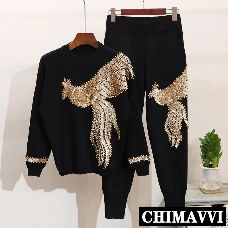 Женский трикотажный костюм из двух предметов, свободный свитер с блестками Феникса и бусинами, спортивные костюмы для отдыха на осень и зиму