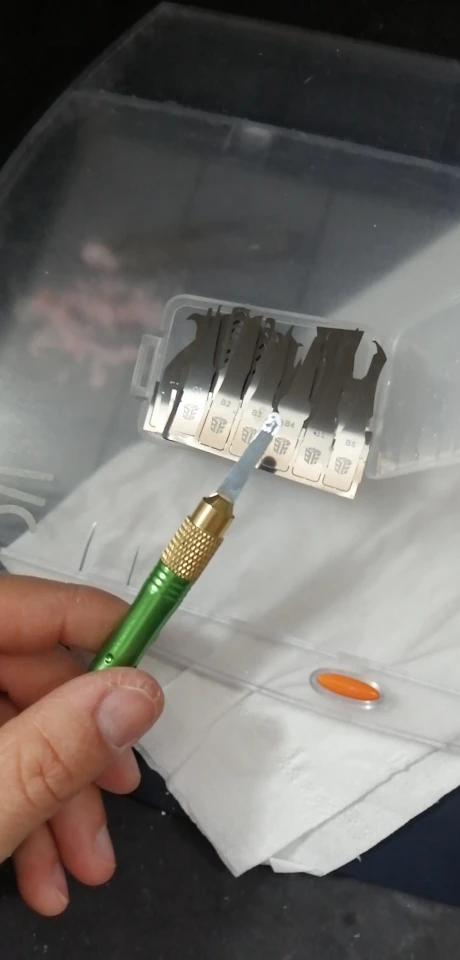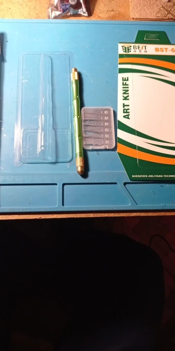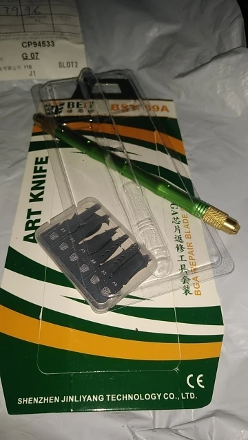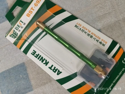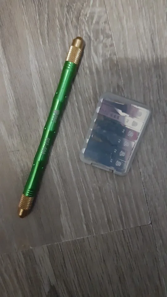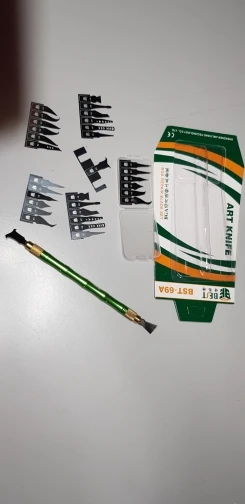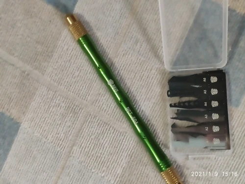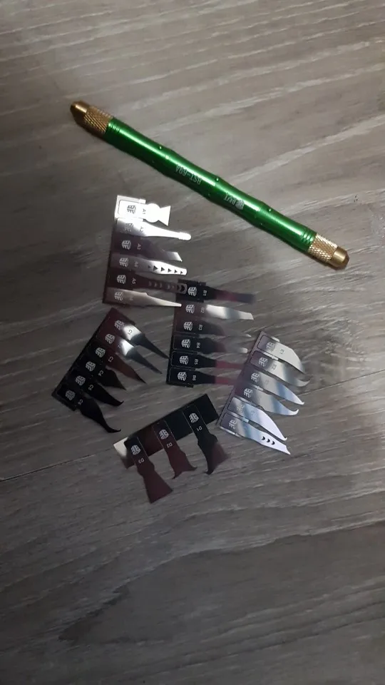 Две недели до МО. Державка люкс, цанги с двух сторон. Лезвия это среднее между бумагой и фольгой. Для клея и демонтажа smd пойдут, для вырезания нужно мутить что то другое. Пять звёзд.