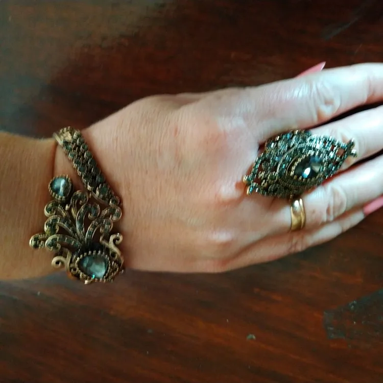 Браслет шикарный, но цвет немного отличается- больше в красноту.Я брала, чтобы был комплект с сережками, но по цвету он отличается.Все равно он бесподобный, под старину, глазки блестят,диаметр примерно 19-20 см.Я довольна этим товаром.Приехал в Н.Н.за 3 недели.Это очень радует.Продавец все отправил быстро.Большое спасибо продавцу, усрехов ему и больших продаж.