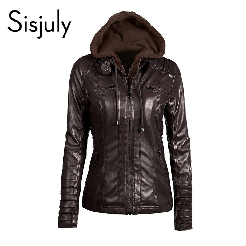 Sisjuly Женская кожаная куртка с капюшоном Черное моторное пальто Тонкая застежка-молния Повседневная куртка Парка Девушки Работа Коричневый PU Зимняя куртка Пальто