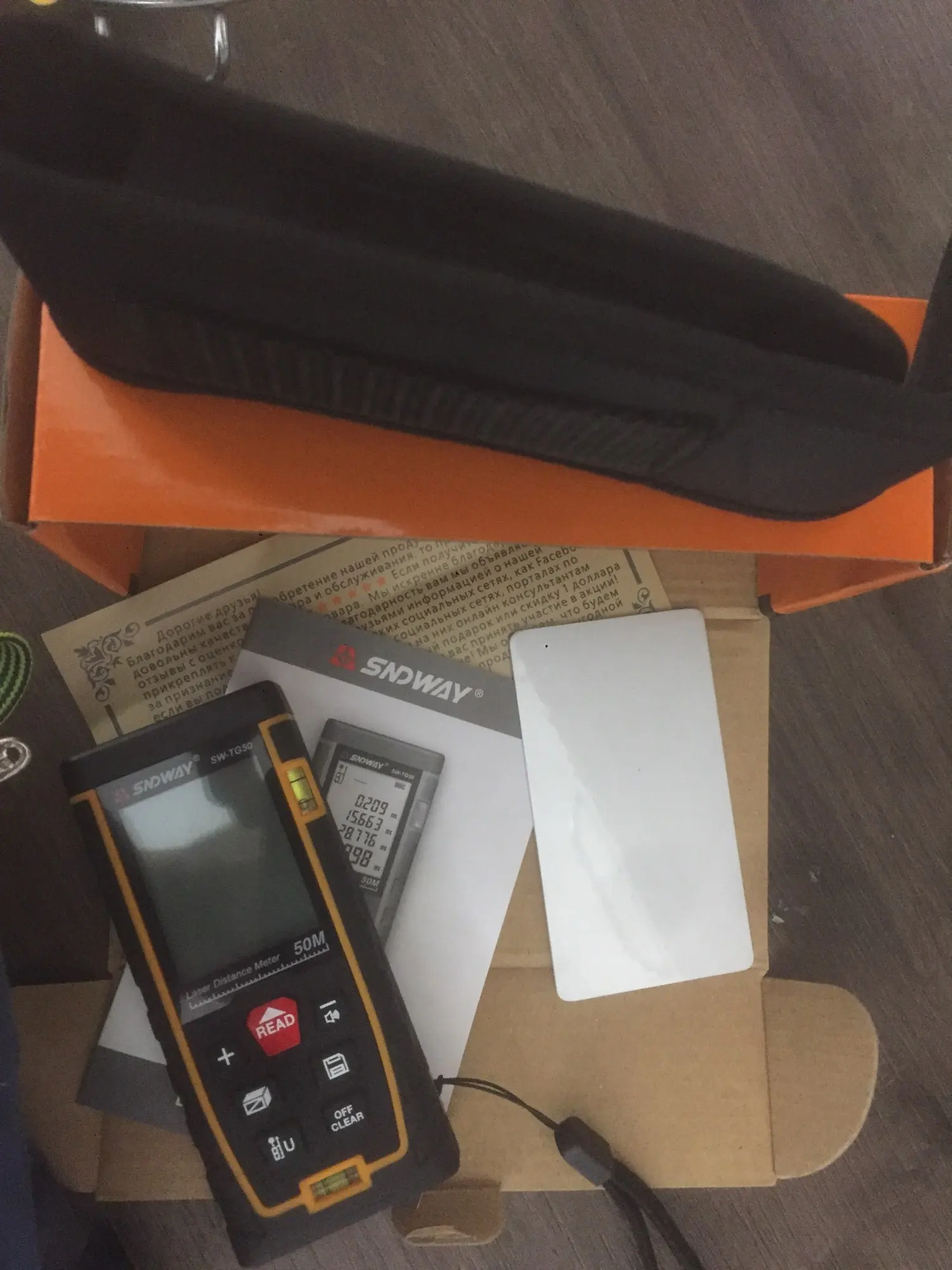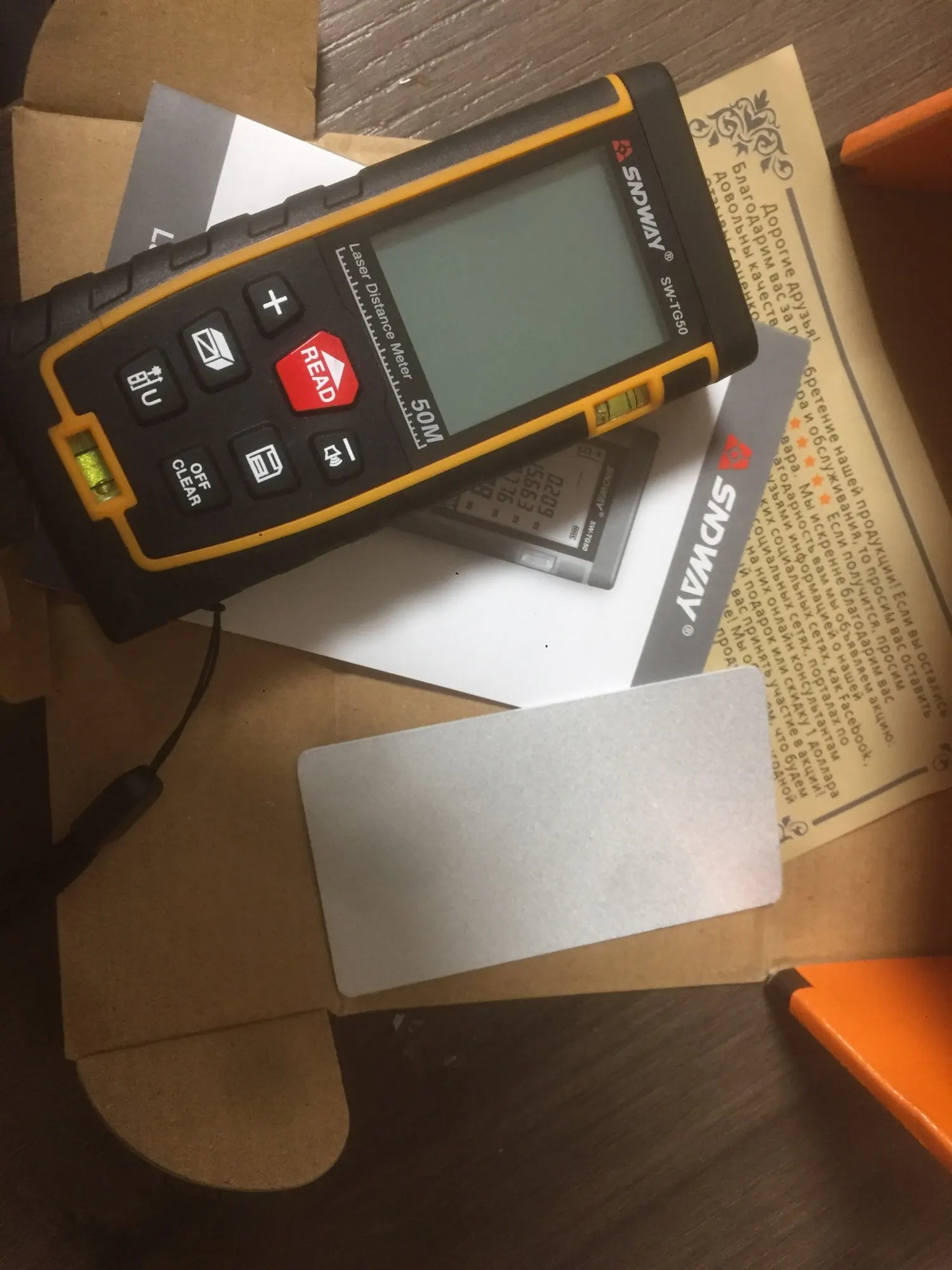 Отличная штука! Точность на высоте, я не могу так точно выставить как она меряет. Днём отлично измеряет на улице, 40 метров без отражалки - все ок. В комплекте инструкция на английском, шнурок на руку, чехол и отражающая мишень (белая пластиковая световозвращающая карточка. В Москву доставили через день, курьером до двери. Продавец общительный, моментально отвечает. За эту цену в москве продается ноунейм до 30 метров.