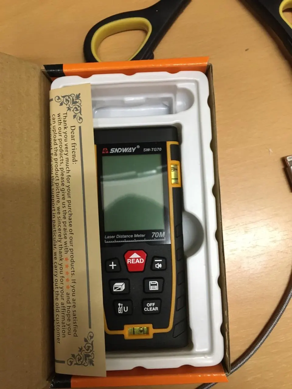 Прибор получил на почте целым. Купил батарейки и проверил работу лазера, всё работает. Ещё бы инструкцию на русском и было бы шикарно. Продавцу спасибо, не обманул.
